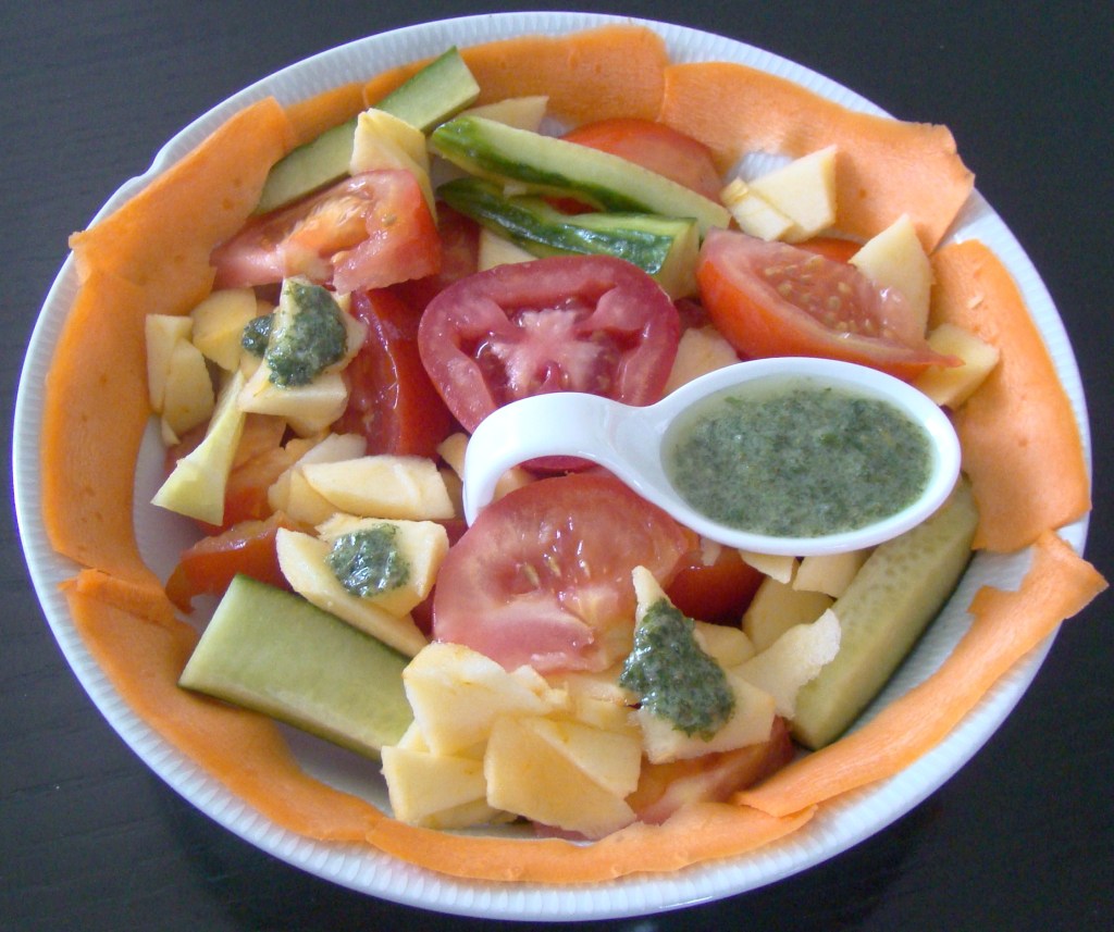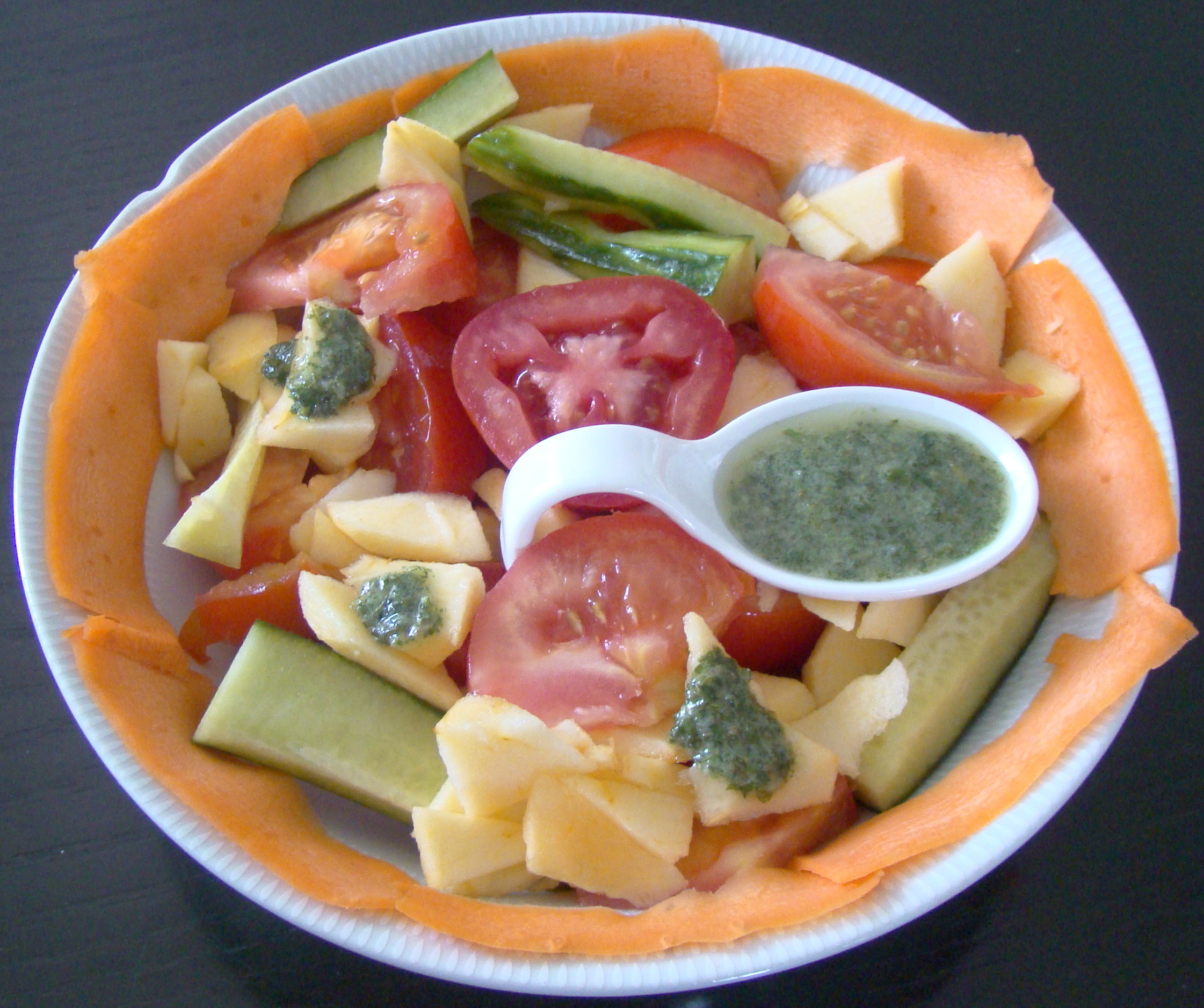 PREPARACIÓN: pelamos y cortamos en lonchas finas (a lo largo) la zanahoria, pelamos y troceamos la manzana y la rociamos con el zumo de medio limón , pelamos y picamos el pepino, los tomates y en el momento de servir la acompañamos con el mojo de cilantro.