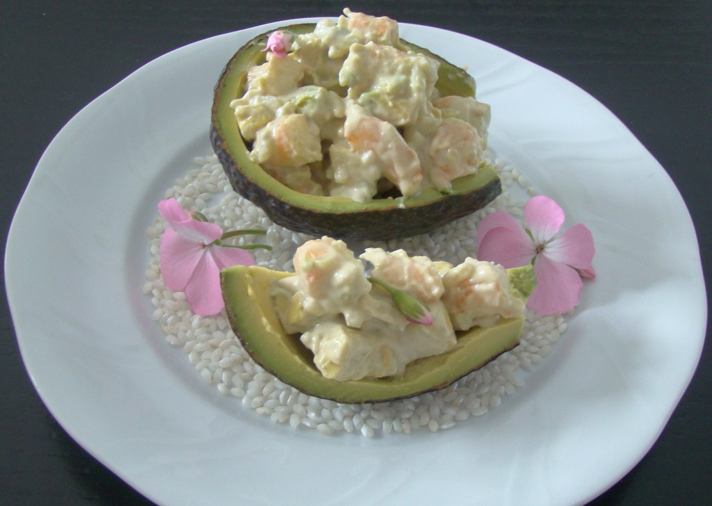 PREPARACIÓN: asamos los langostinos, pelamos y reservamos. Partimos el aguacate por la mitad y vaciamos. Hacemos una salsa con la mayonesa, la mostaza, el aceite, el jugo de limón y añadimos el aguacate y los langostinos cortados en trocitos y el arroz que hemos guisado y dejado enfriar. Mezclamos y rellenamos el aguacate.