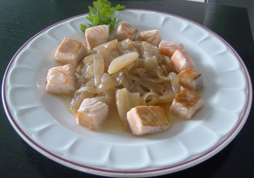 PREPARACIÓN: pelamos y cortamos la cebolla, la sofreímos, agregamos el Brandy, la sal y mezclamos; seguimos la cocción hasta qué estén pochadas. Cortamos el salmón en pequeños tacos en otro sartén con una cucharadita de aceite y asamos vuelta y vuelta. Apartamos y servimos.