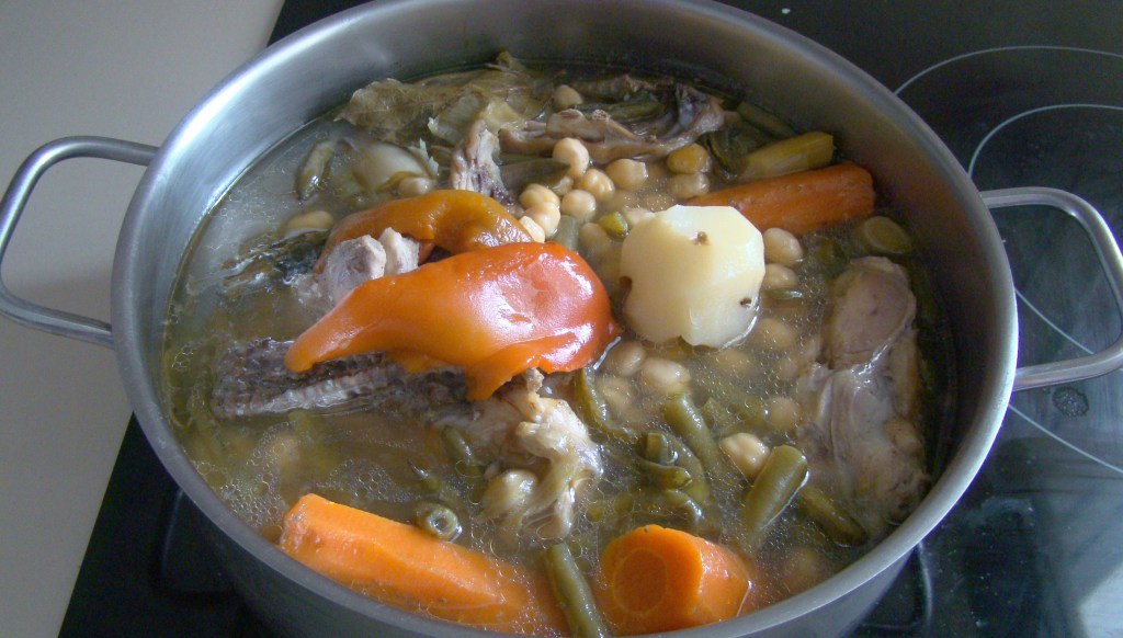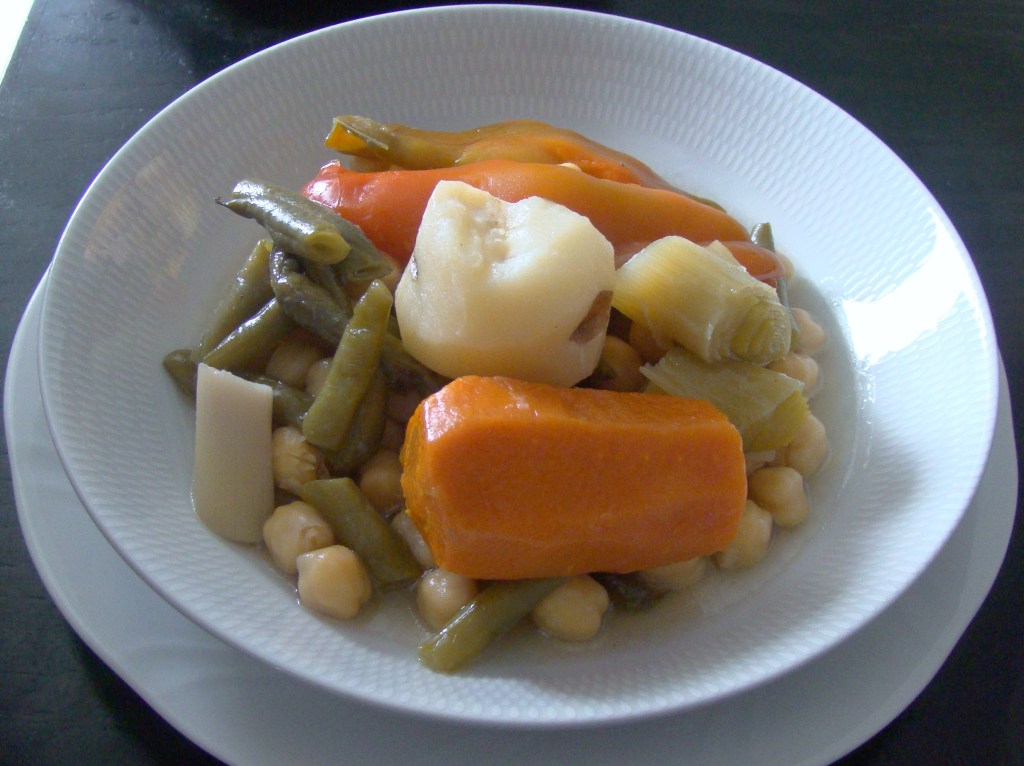PREPARACIÓN: lavamos y dejamos la noche anterior las garbanzos en remojo con el perejil y el laurel. Al día siguiente ponemos en un caldero adecuado la misma agua en que han estado en remojo. Cuando esté tibia añadimos los garbanzos con los trozos de pollo que hemos sofrito antes. Utilizamos el mismo aceite para sofreír los ajos, el pimiento, el puerro y lo añadimos. Cuando comience a hervir calculamos para a los 20 minutos añadir la zanahoria, las habichuelas y las papas. Guisamos a fuego lento sin tapar aproximadamente unos 40 minutos más. Comprobamos antes de apartar que los garbanzos estén guisados.