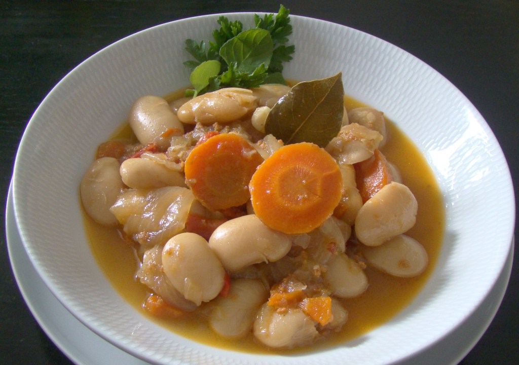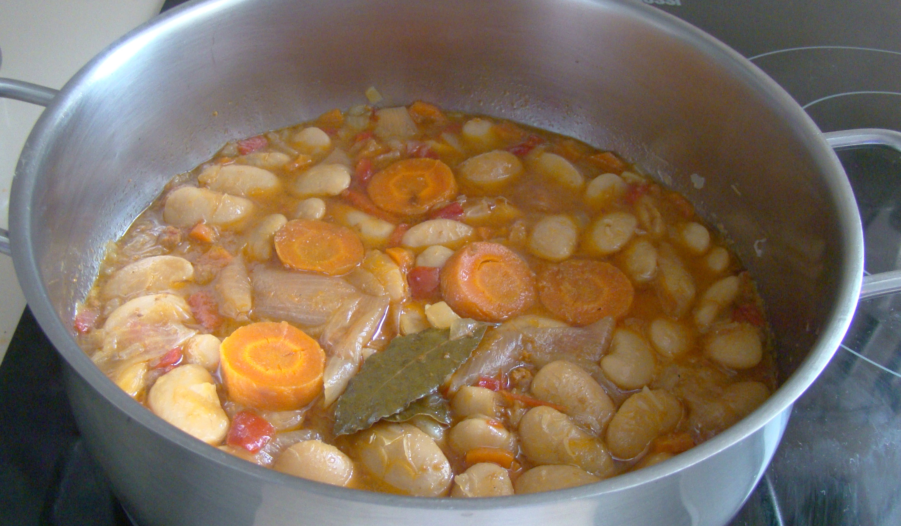 INGREDIENTES: 400 gramos de judías, 2 cebollas, 3 dientes de ajo, 1 chorizo perro, 1 hoja de laurel 1 zanahoria, 1 pimiento encarnado, 3 cucharadas de aceite de oliva, 2 cucharadas de Brandy y sal al gusto.