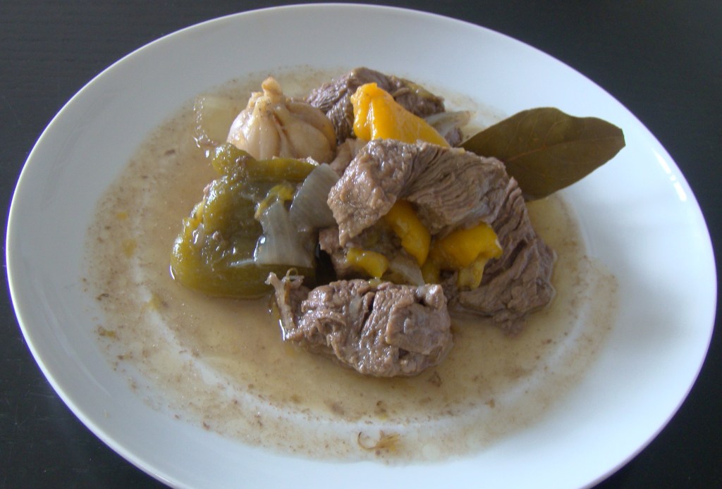 INGREDIENTES: 1.800 gramos de lomo alto de ternera, 2 hojas de laurel, 3 pimientos (1 verde, 1 amarillo, 1 encarnado), 1 cabeza de ajo, 3 cucharadas de aceite de oliva virgen, 2 cucharadas de Brandy, 3 cebollas ( 2 blancas y 1 roja) y 1 cucharada de sal gorda.