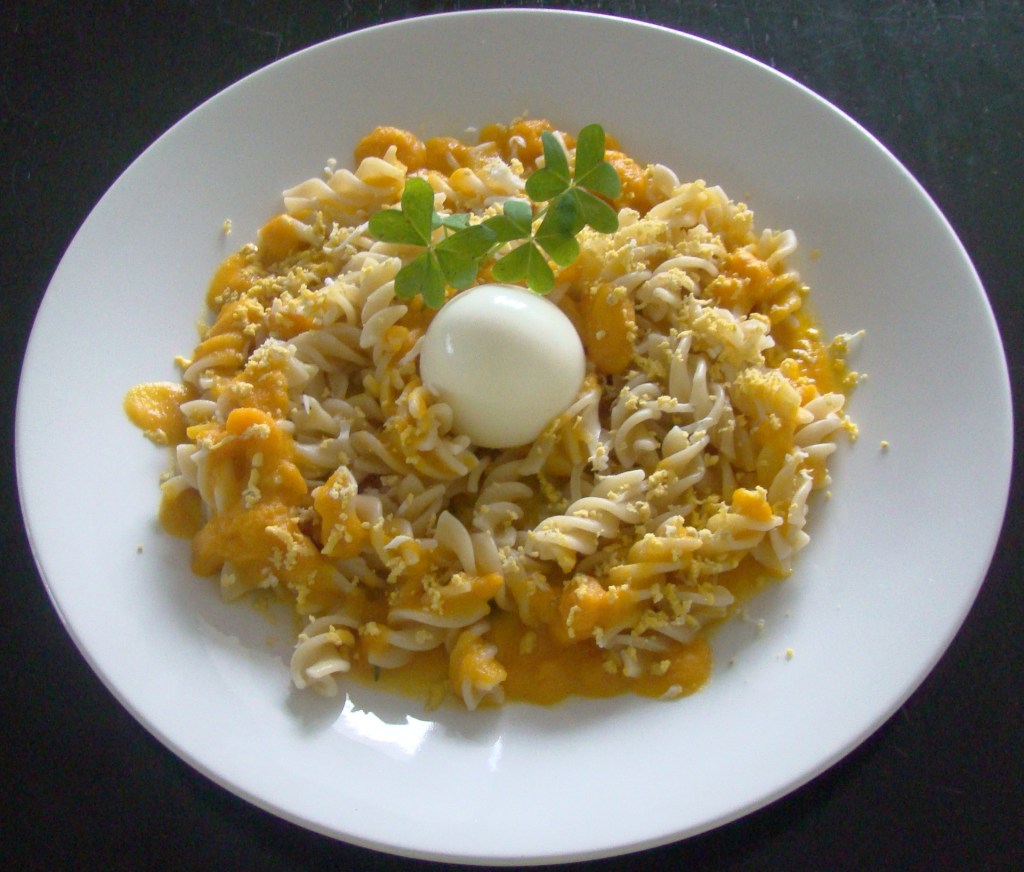 PREPARACIÓN: guisamos los huevos, quitamos la cáscara y reservamos. Hacemos un sofrito con los ajos y las zanahorias con un poquito de agua y guisamos durante 20 minutos a fuego suave; trituramos y hacemos una salsa. Guisamos la pasta, 12 minutos de cocción. A l momento de servir, en cada plato, ponemos la pasta, añadimos un poco de salsa, el orégano, la mitad de huevo rallado y colocamos la otra mitad en el plato.