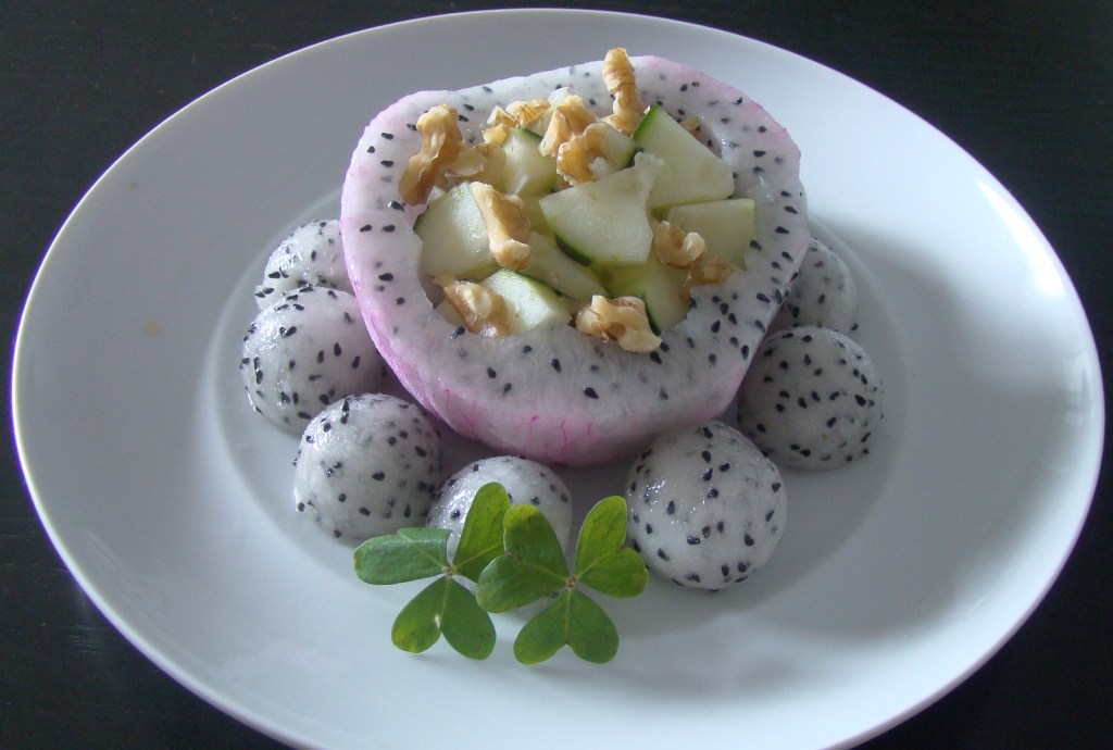 PREPARACIÓN: pelamos la pitahaya cortamos en laminas, el plátano a lo largo por la mitad. Añadimos el millo y decoramos con el geranio y el perejil (ambos comestibles). En el momento de servir añadimos una cucharadita de miel de palma. https://www3.gobiernodecanarias.org/medusa/wiki/index.php?title=Miel_de_Palma