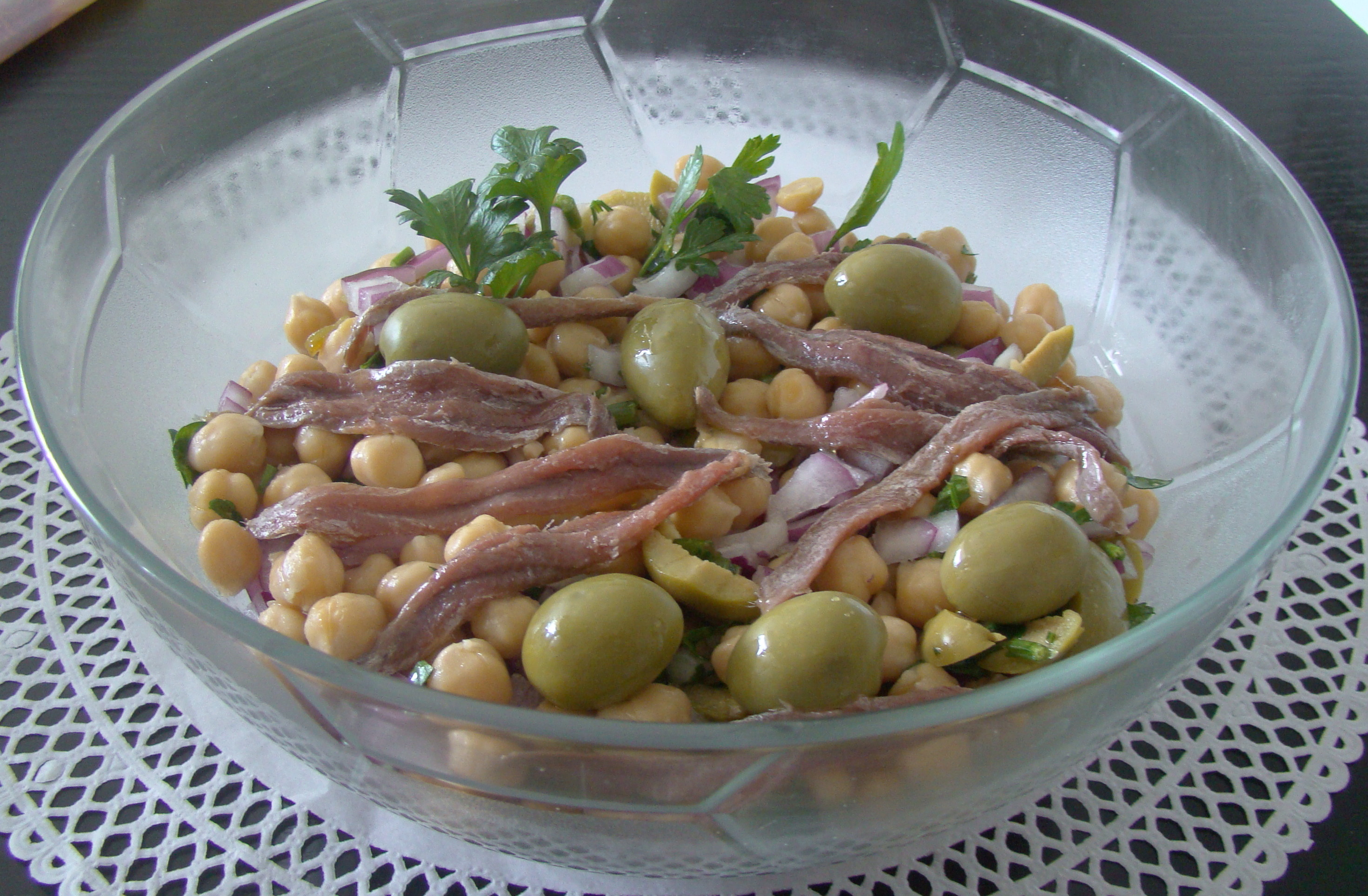 PREPARACIÓN: ponemos los garbanzos en remojo la noche anterior. Guisamos, escurrimos, dejamos enfriar y añadimos la cebolla picadita, el perejil, las aceitunas y los filetes de anchoas.
