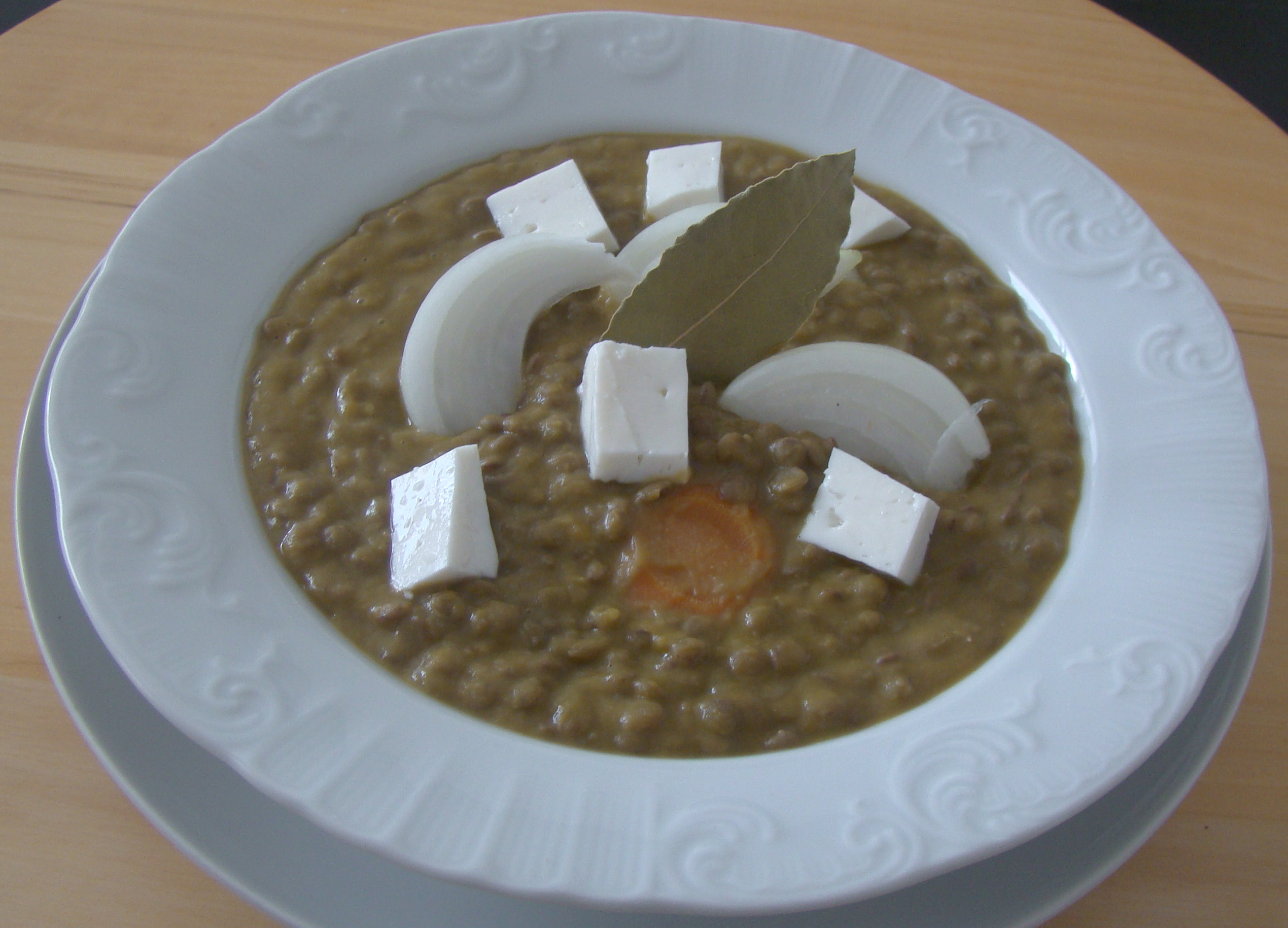 INGREDIENTES: 500 gramos de lentejas, 1 trocito de calabaza, 1 zanahoria, 1 cebolla, 2 dientes de ajo, 1 hoja de laurel, 1 cucharadita de comino, 2 cucharadas de aceite de oliva, 1 trocito de queso de cabra, 1 cebolla blanca cruda y sal al gusto.