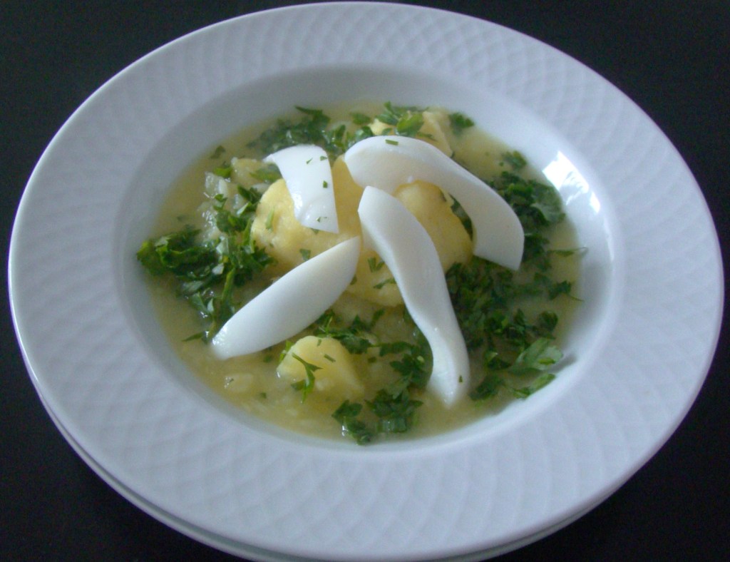 PREPARACIÓN: pelamos y cortamos en trocitos las papas y la batata. Ponemos en el aceite caliente los ajos picaditos, añadimos las papas y la batata y sofreímos 5 minutos más. Agregamos agua que las cubra y sal al gusto y seguimos la cocción. Cuando estén guisadas, las escachamos y añadimos el arroz lavado, junto con el perejil muy picadito. Mantenemos 4 minutos de cocción y apartamos. Reposamos 5 minutos y podemos servir con huevo duro.