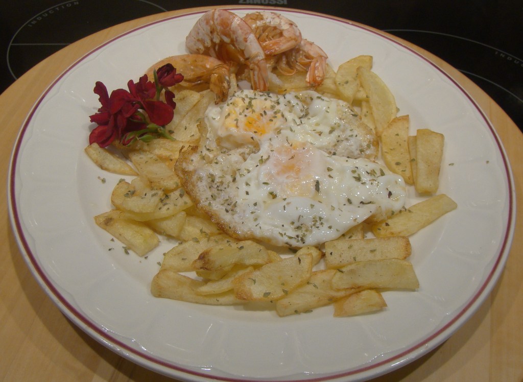 PREPARACIÓN: pelamos y cortamos las papas freímos las papas y, cuando estén a punto, freímos los huevos y asamos las gambas (con una cucharadita de aceite, vuelta y vuelta 1 minuto). Las salamos antes de sacarlas. Emplatamos y al momento de servir le añadimos el orégano.