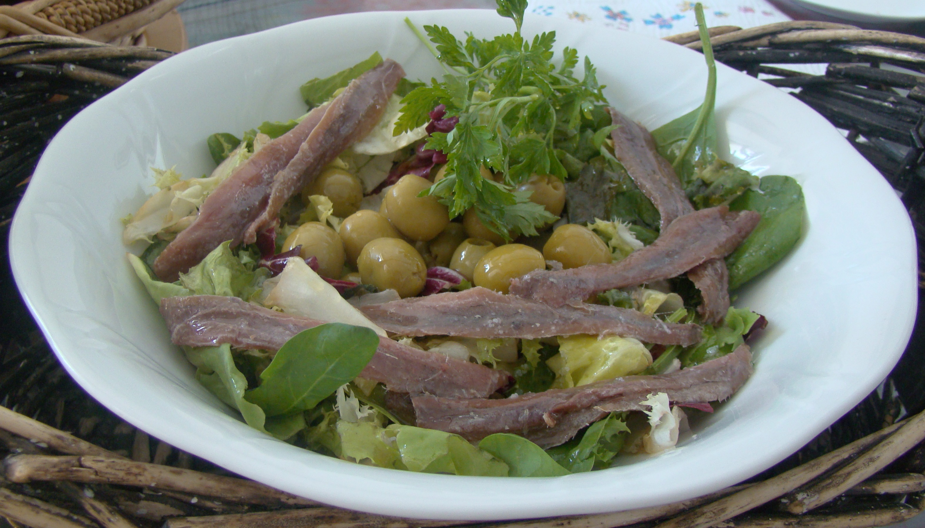 INGREDIENTES: 1 bolsa de lechugas variadas, 1 lata pequeña de aceitunas, 1 lata de anchoas, vinagre de cerezas y aceite de oliva virgen.