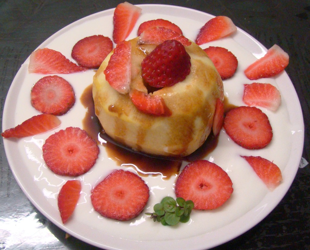 PREPARACIÓN: ponemos el yogur en un cuenco y batimos con un tenedor. Ponemos la manzana pelada 1 minuto al microondas. Mientras, batimos el yogur y lo emplatamos con las fresas (lavadas y troceadas). Rociamos con la miel.