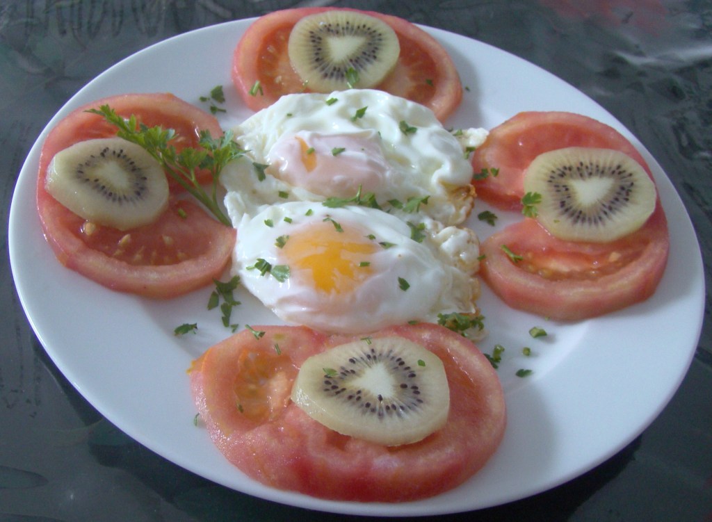 PREPARACIÓN: cortamos en rodajas el tomate y el kiwi, freímos los huevos y al momento de servir añadimos el perejil picadito.