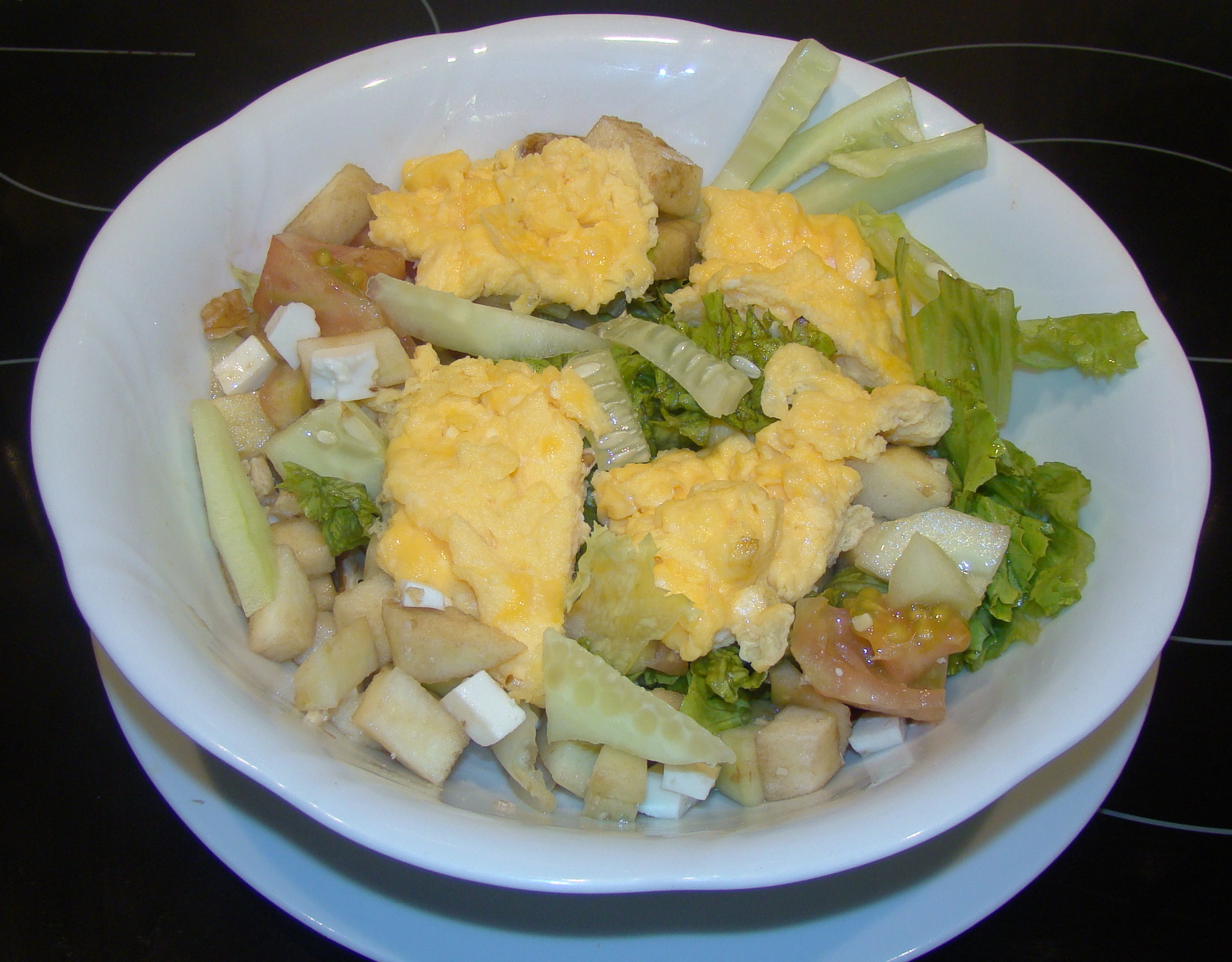 PREPARACIÓN: lavamos y trroceamos las hortalizas y el queso y aliñamos. Batimos los huevos (queda más espumosa y rica si batimos las claras primero) y hacemos una tortilla francesa con la pizca de sal. La troceamos y la a a la ensalada.