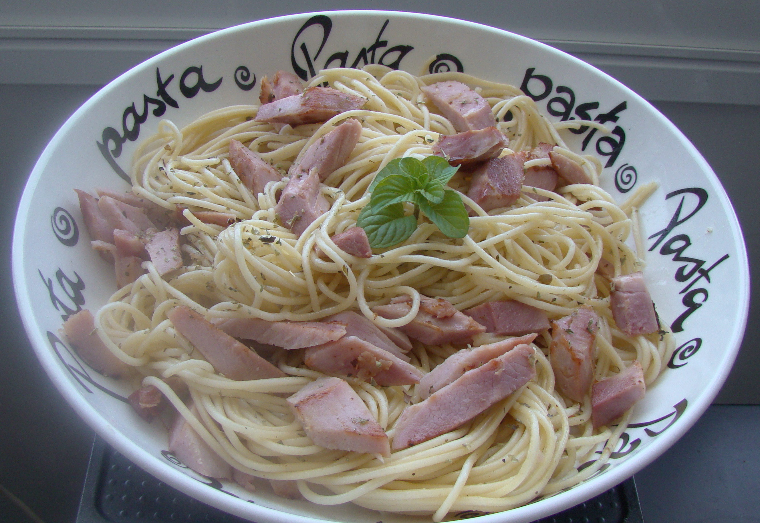 INGREDIENTES: 250 gramos de espaguetis, 300 gramos de jamón york, 1 cucharadita de aceite de oliva virgen, una cuharadita de tomillo seco y orégano mezclados.