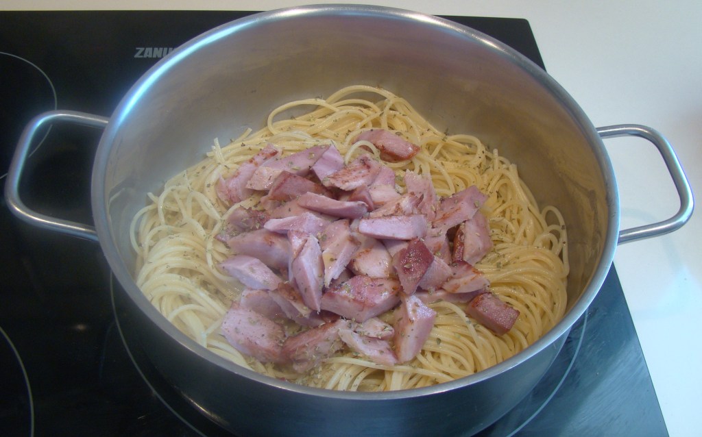 PREPARACIÓN: en un caldero adecuado ponemos aproximadamente 2 litros de agua y cuando rompa el hervor agregamos los espaguetis y guisamos durante 12 minutos, sacamos, escurrimos el agua y reservamos. Mientras se guisan los espaguetis cortamos el jamón y lo vamos asando en una sartén con el aceite. Al momento de servir añadimos las especias.