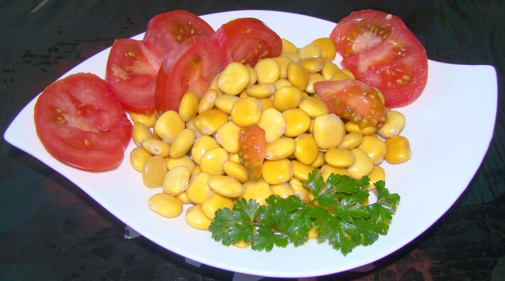 INGREDIENTES: 200 gramos de altramuces (En canarias, chochos), 1 tomate, aceite de oliva virgen y vinagre de manzana.