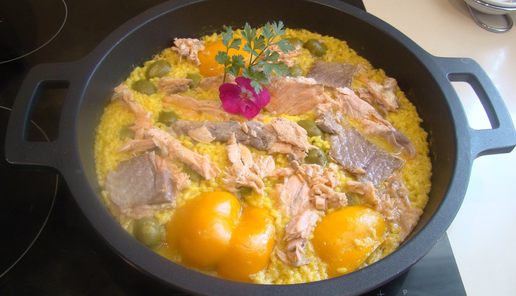 INGREDIENTES: 1 vaso de arroz, salmón, pimiento amarillo, 1 cebolla, 3 dientes de ajo, 1/2 vasito de Brandy, 1/ 2 cucharadita de cúrcuma, 1/2 cucharadita de comino, 2 cucharadas de aceite de oliva, 1 vaso de aceitunas y sal al gusto.