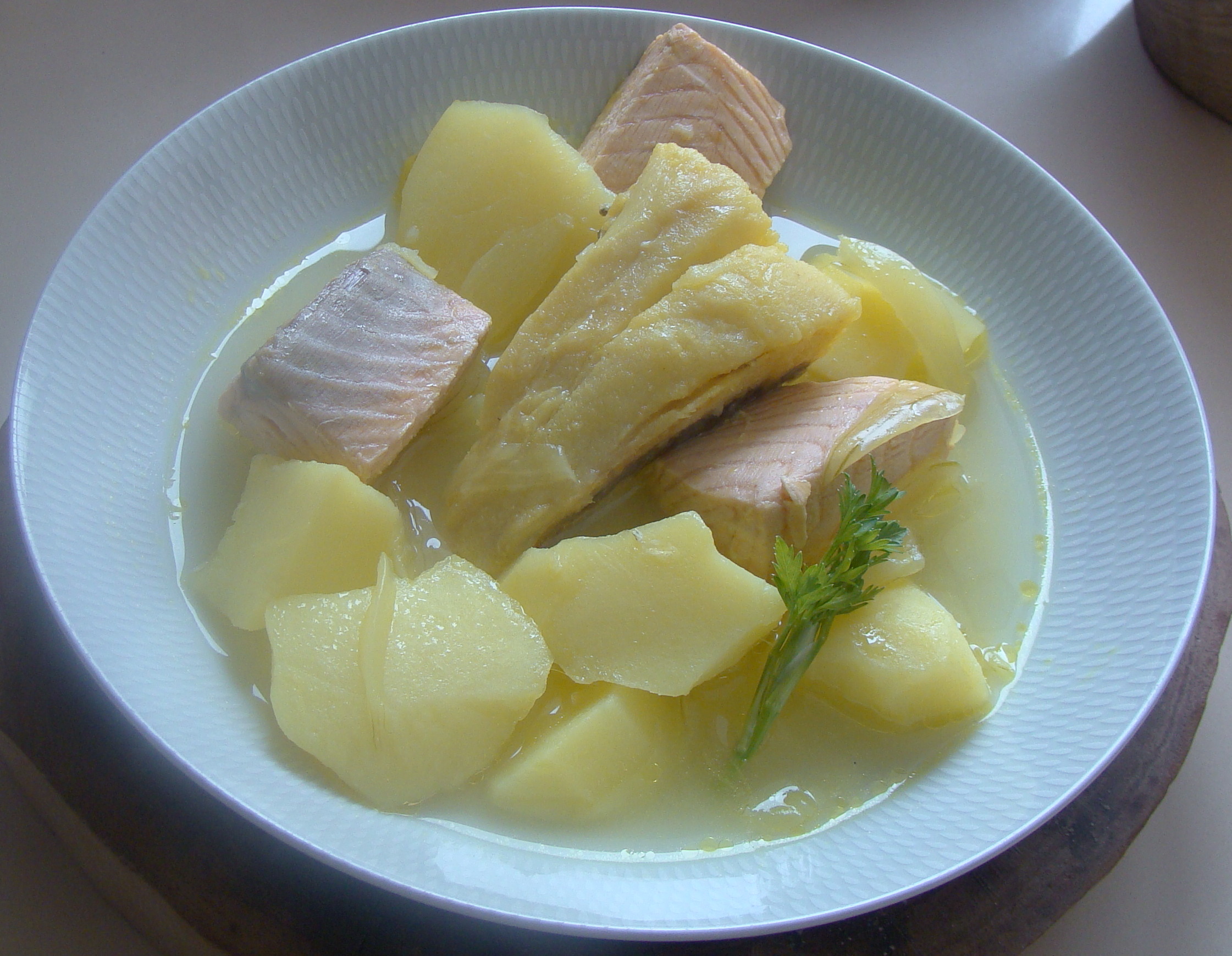 PREPARACIÓN: ponemos en remojo el pescado salado toda la noche anterior. Hacemos un sofrito con la cebolla y los ajos; cuando esté el sofrito añadimos las papas cortadas en trozos y cuando éstas estén a punto de estar guisadas añadimos el cherne y terminamos en unos 3 minutos de cocción . Añadimos el salmón y apagamos el fuego. Dejamos reposar 10 minutos y servimos.