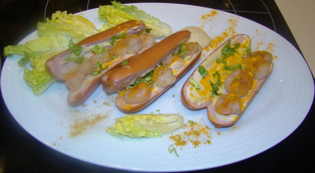 PREPARACIÓN: doramos las salchichas en una sartén y reservamos. Asamos las gambas con el aceite, mezclamos la mayonesa con la mostaza, abrimos las salchichas sin llegar a cortarlas totalmente, untamos ambos lados con la salsa y rellenamos con las gambas, picamos muy menudita la lechuga (cogollo de Tudela) y esparcimos por encima junto con el curry y la cúrcuma.