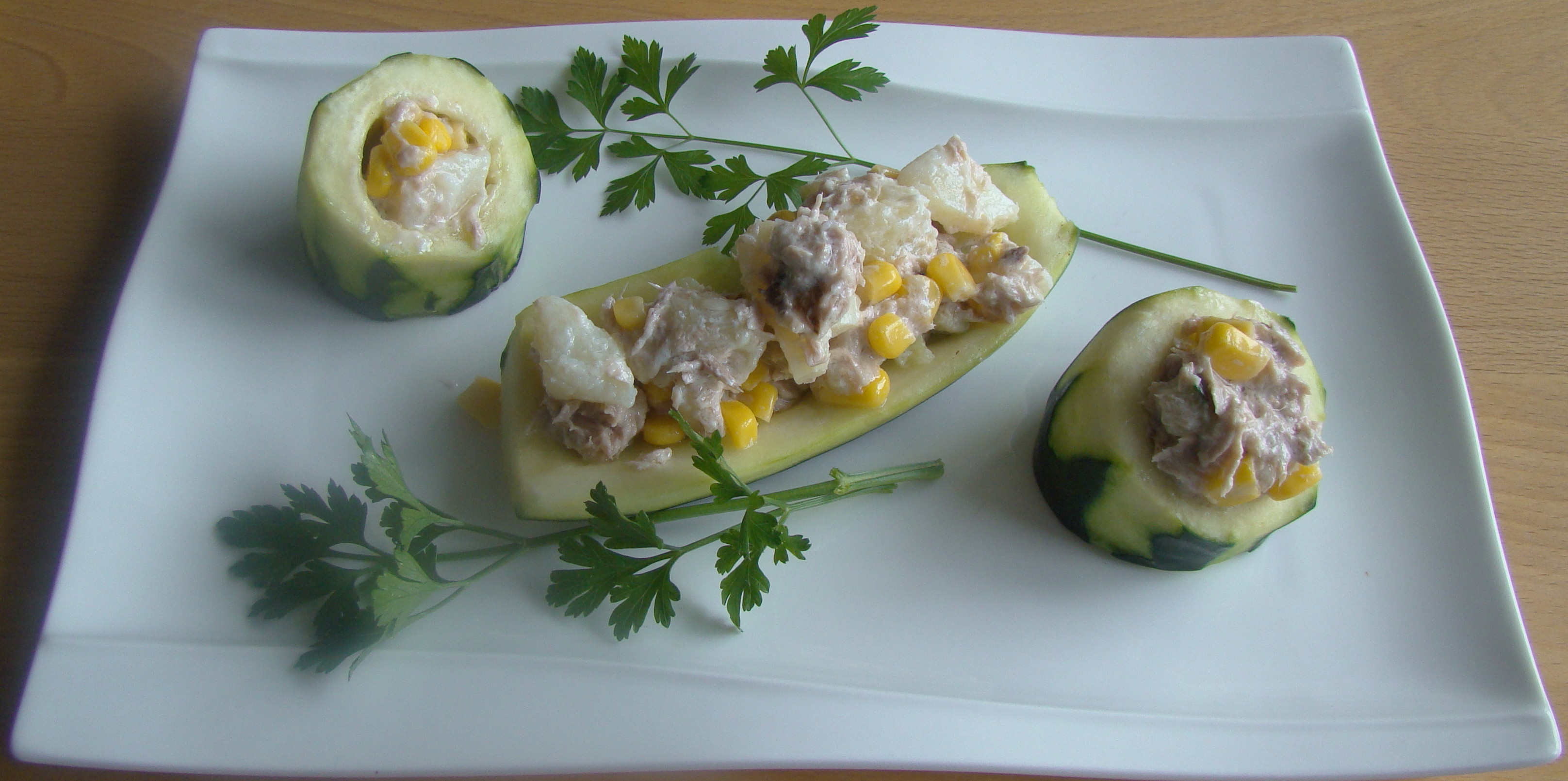 PREPARACIÓN: quitamos un poco la piel y vaciamos el pepino. En un cuenco adecuado ponemos el yogur, y añadimos la pulpa de pepino extraída, el maíz, el atún (escurrimos el aceite), las papas guisadas y cortadas pequeñitas, mezclamos con suavidad y rellenamos.