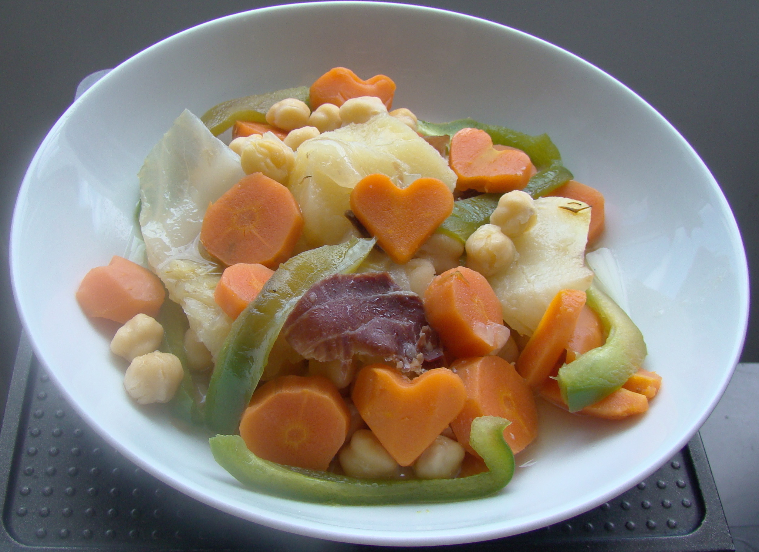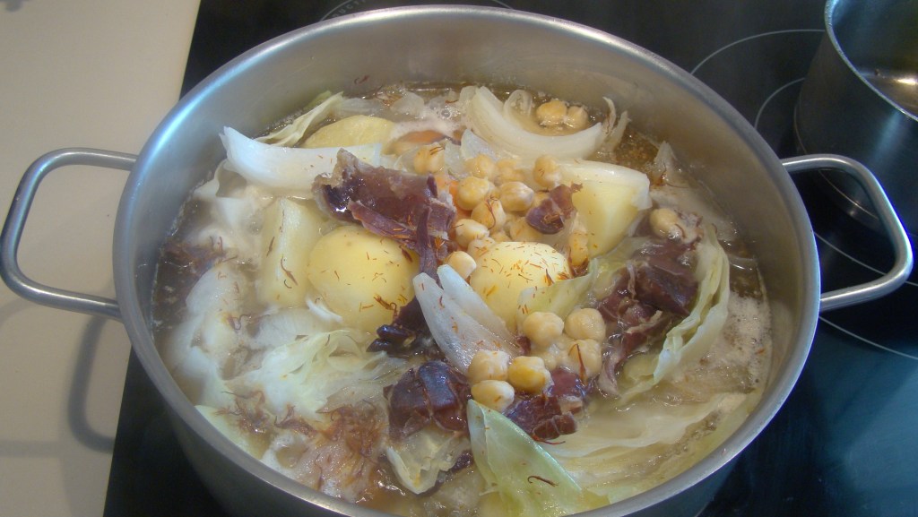 PREPARACIÓN: hacemos el sofrito con la cebolla y los ajos picaditos. Agregamos 4 vasos de agua y cuando esté tibia, añadimos los garbanzos. Añadimos el jamón, la col, la zanahoria, el pimiento , las papas y la sal. al final de la cocción añadimos el azafrán.