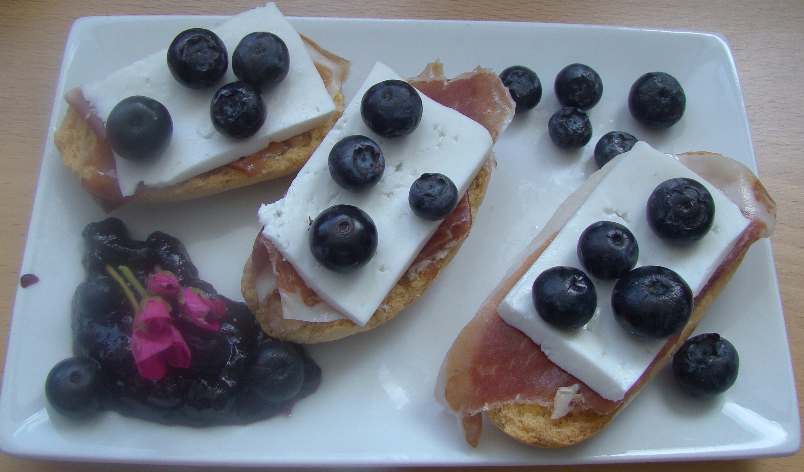 INGREDIENTES: jamón serrano, queso de cabrá tierno, arándanos frescos, pan tostado y mermelada de arándanos.