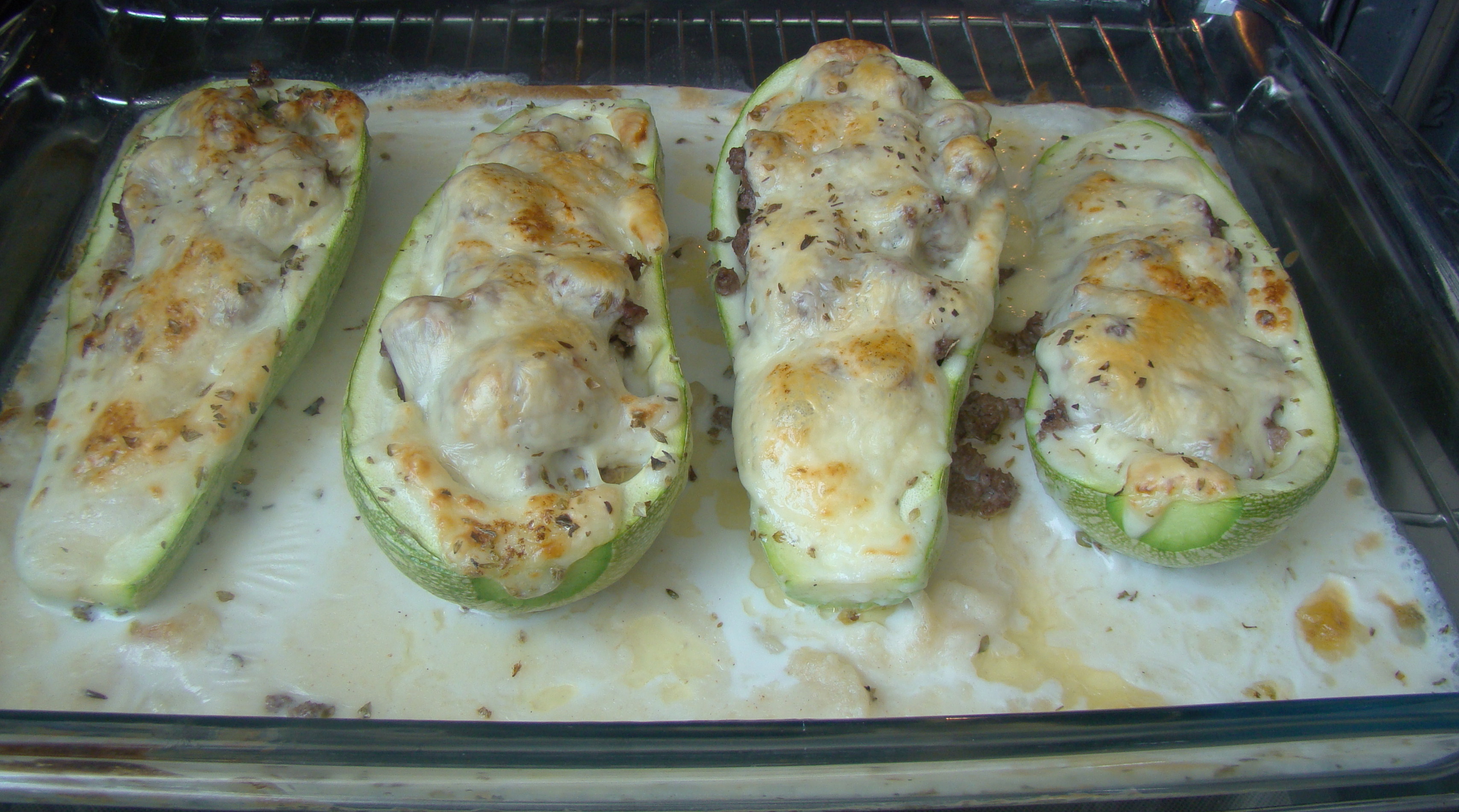 PREPARACIÓN: vaciamos los calabacines y reservamos. Salpimentamos la carne y la doramos en una sartén con un poquito de aceite. Rellenamos los calabacines con la carne y les vamos poniendo las lonchas de queso encima. Ahora hacemos la bechamel y la repartimos por encima y por fuera. añadimos unas cucharadita de mantequilla, ponemos al horno 14 minutos. Los calabacines quedan al dente ya que no guisamos pero están deliciosos.