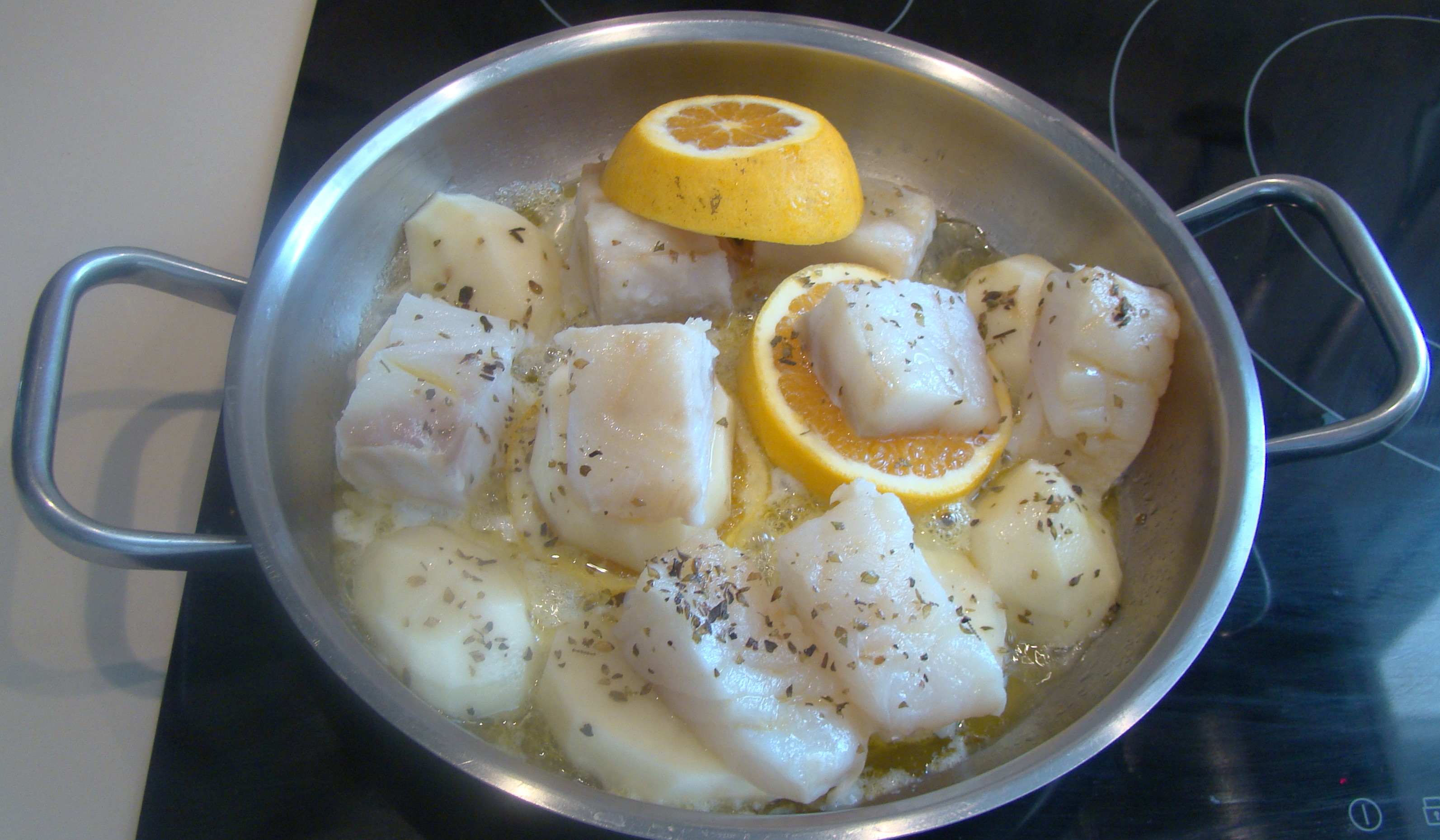 PREPARACIÓN: ponemos la noche anterior el bacalao a descongelar en la nevera. Lavamos y cortamos en rodajas los cítricos y añadimos el aceite, el brandy y las especias. Dejamos el bacalao en maceración un mínimo de 2 horas, le añadimos las papas cortadas en rodajas y guisamos con el caldero tapado durante 15 minutos.. No es necesario añadir sal ni agua para la cocción.