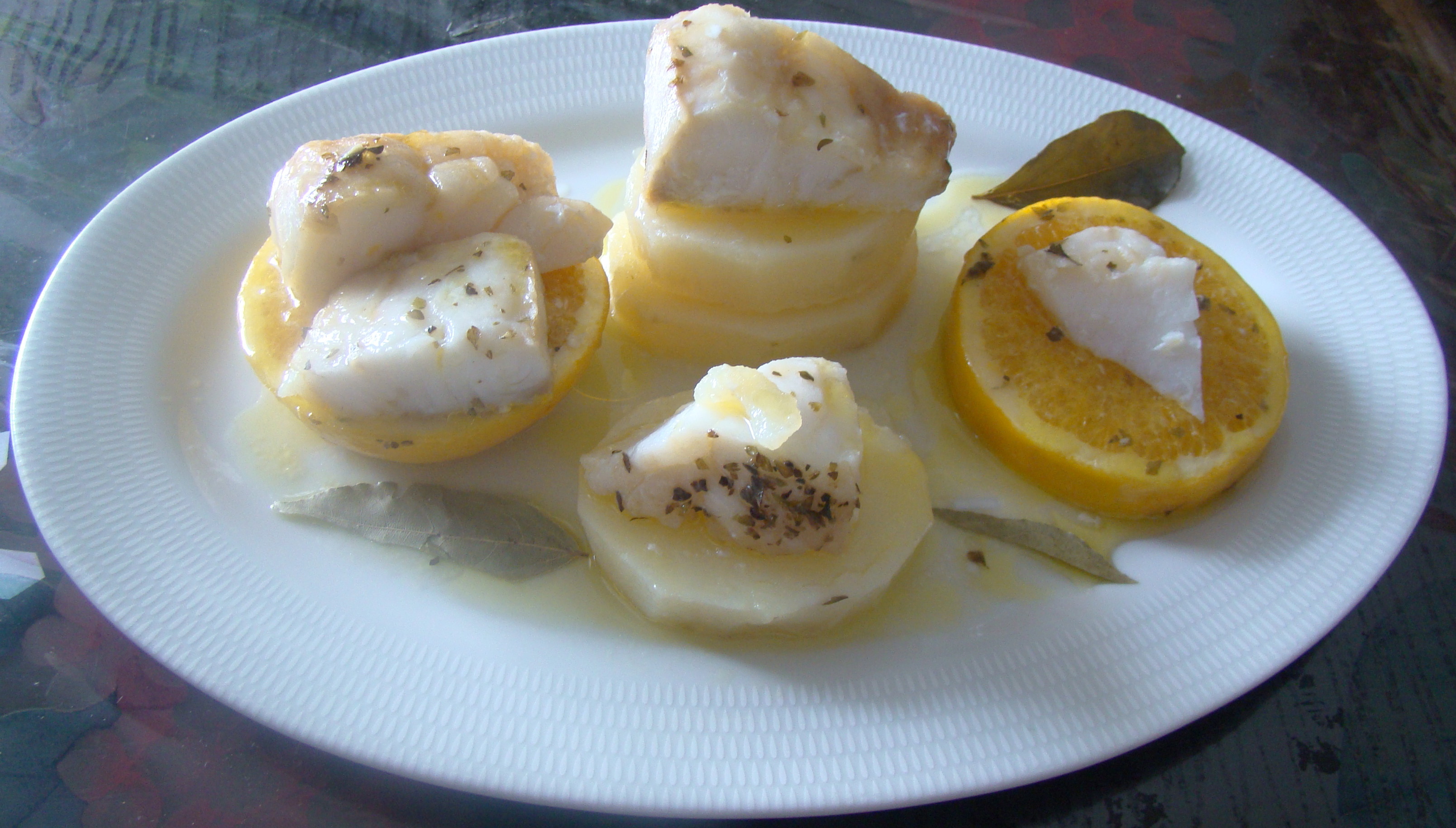 INGREDIENTES: 4 lomos de bacalao, 2 papas, 1 naranja, 1 limón, 2 cucharadas de aceite de oliva virgen, 1 cucharada de Brandy y 1 cucharadita de orégano y tomillo.