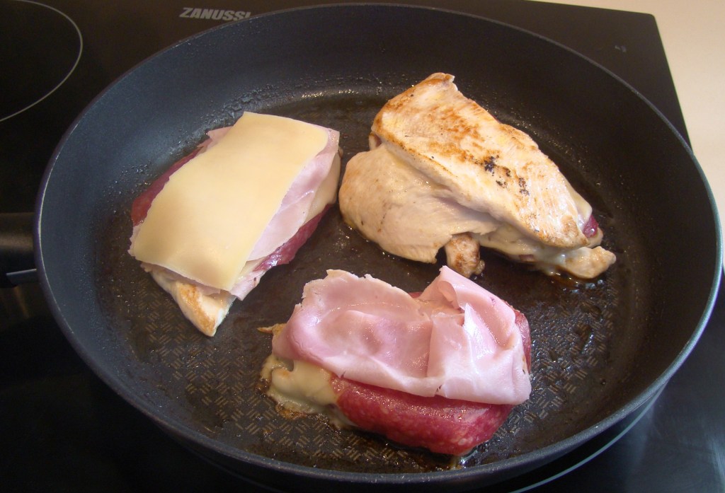 PREPARACIÓN: partimos cada filete en dos y doramos las pechugas salpimentadas. Cuando estén casi listas, disponemos las lonchas de chacina en el medio de las dos mitades como si de un sandwich se tratase y mantenemos al fuego hasta que se derrita el queso según gustos.