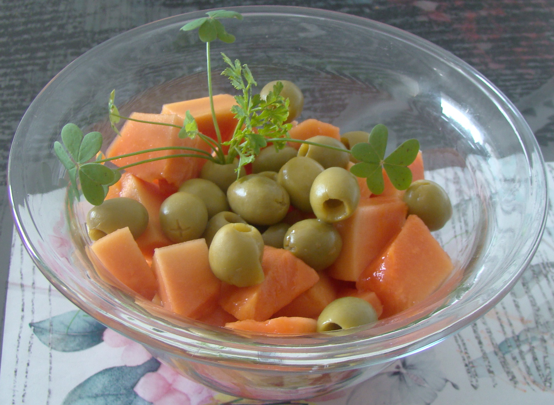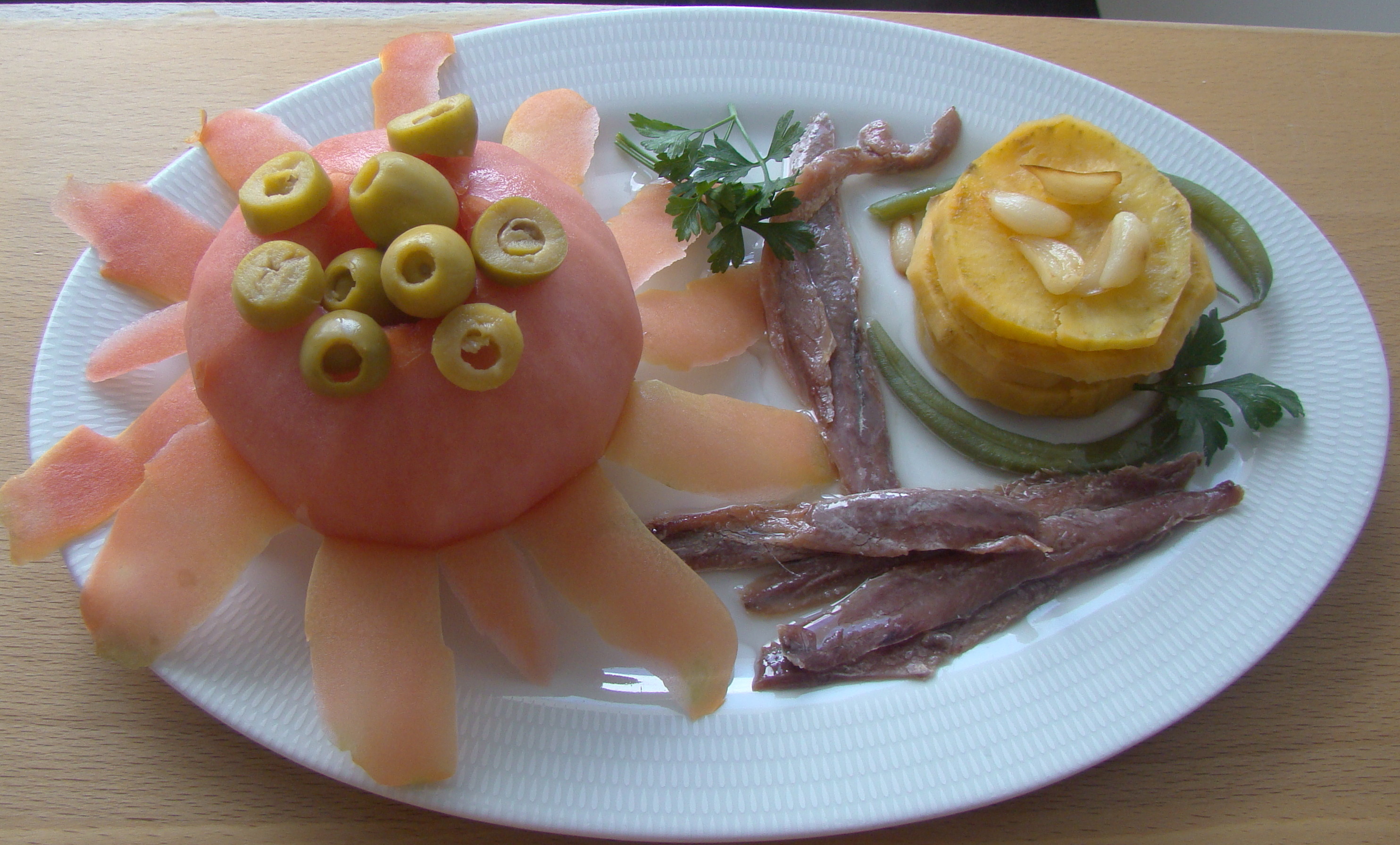 .INGREDIENTES: 1 lata de anchoas en aceite de oliva, 1 tomate, 1 lata de aceitunas rellenas de anchoas 4 rodajas de batata y 2 dientes de ajo.