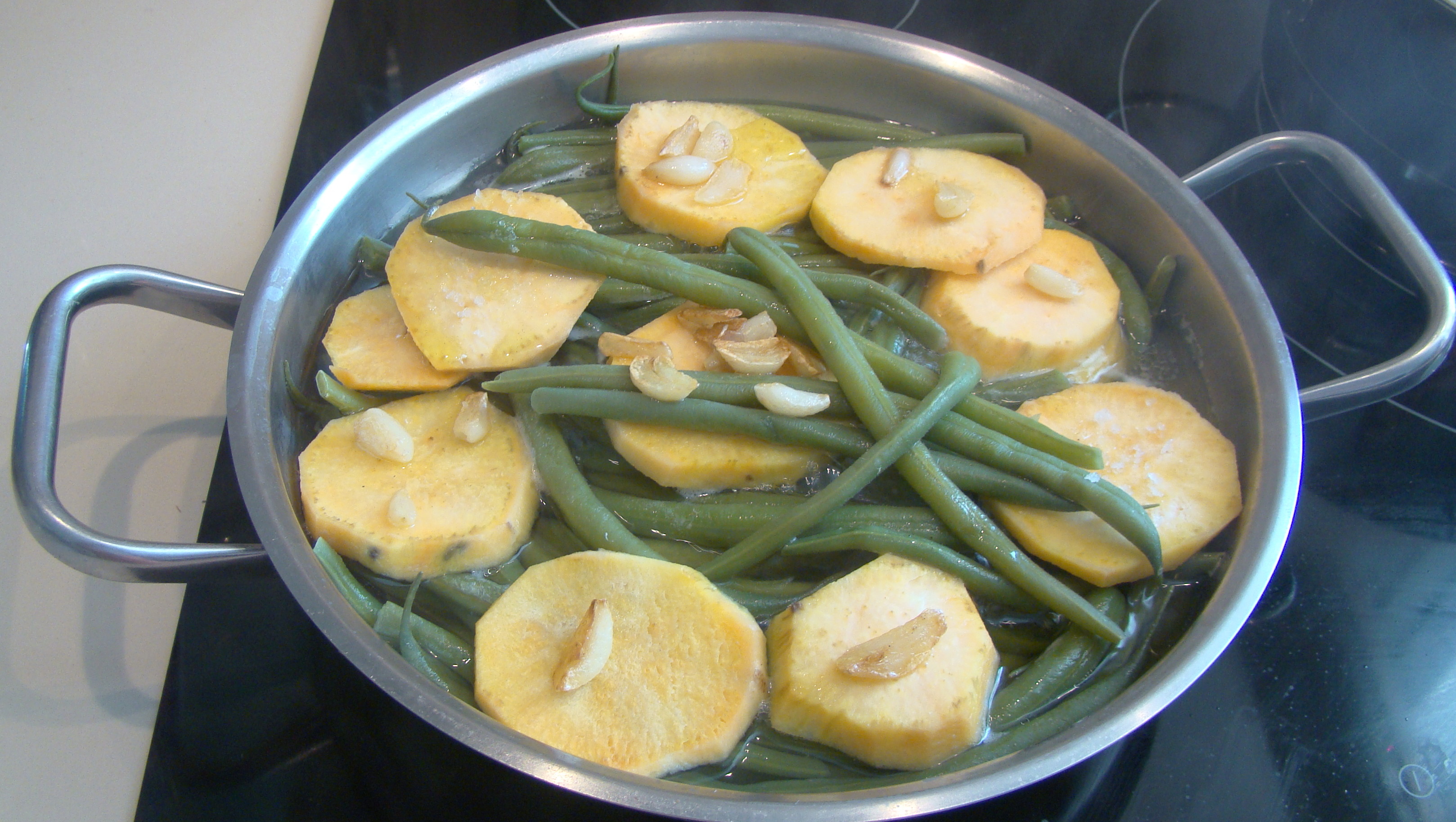 INGREDIENTES: 300 gramos de habichuelas tiernas, 1 batata, 4 dientes de ajo, 1 cucharada de aceite de oliva y sal al gusto.