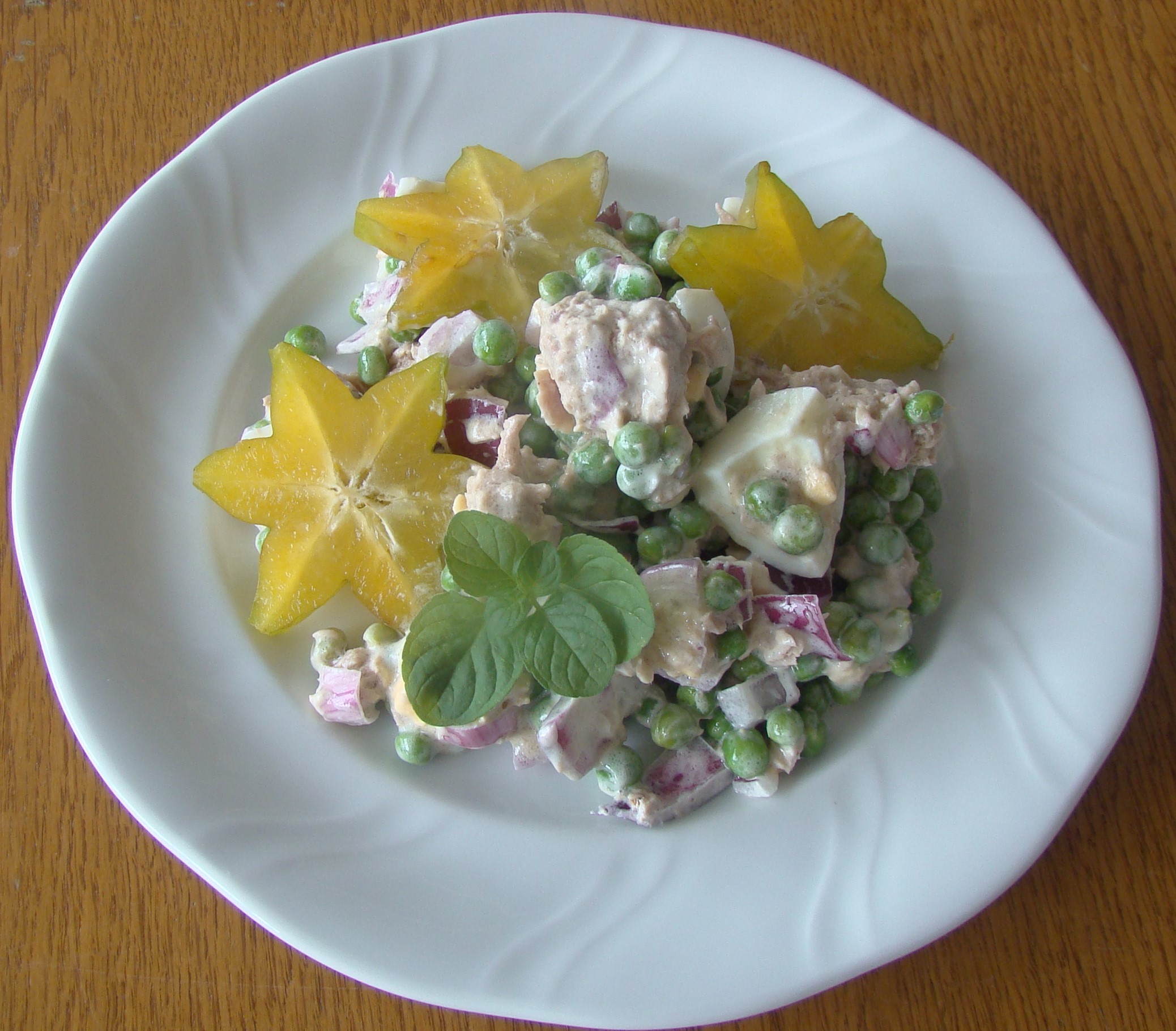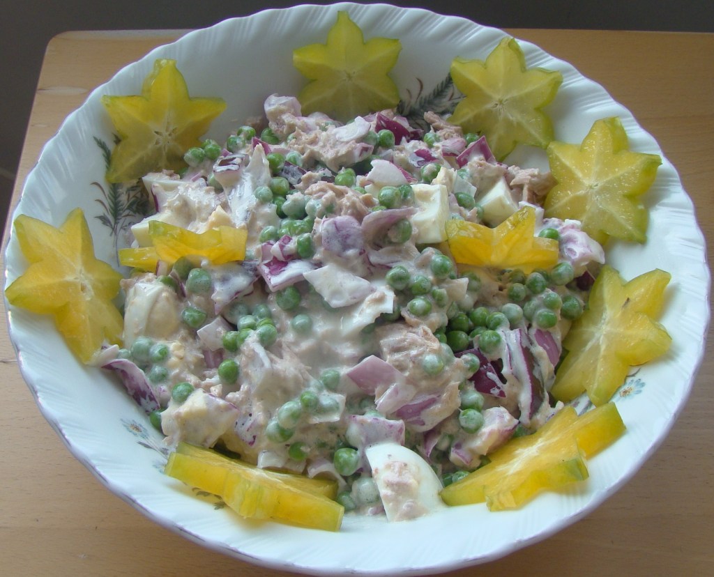 PREPARACIÓN: ponemos las arvejas en un escurridor para que se vayan descongelando y, una vez descongeladas, le echamos un poco de agua, y dejamos un poco más de tiempo escurriendo. Mientras, ponemos los huevos a guisar durante 10 minutos. Lavamos la cebolla, la picamos menudita y ponemos en un cuenco con las arvejas ya escurridas. En un cuenco ponemos el vinagre, el aceite, la mayonesa y mezclamos con mucha suavidad. Añadimos a las arvejas y la cebolla el atún, los huevos picados, la mezcla de mayonesa, aceite y vinagre y mezclamos con suavidad. Ponemos en la nevera al menos 1 hora antes de servir. Al momento de servir añadimos la carambola cortada.