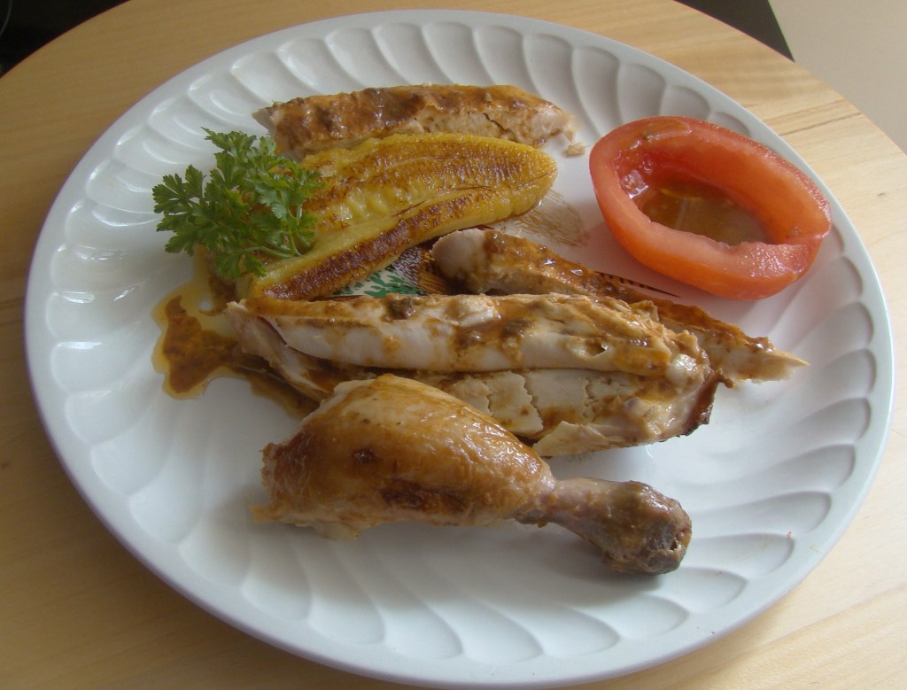 INGREDIENTES: 1 pollo asado, 1 ramita de perejil, 1 plátano y 1 un tomate.