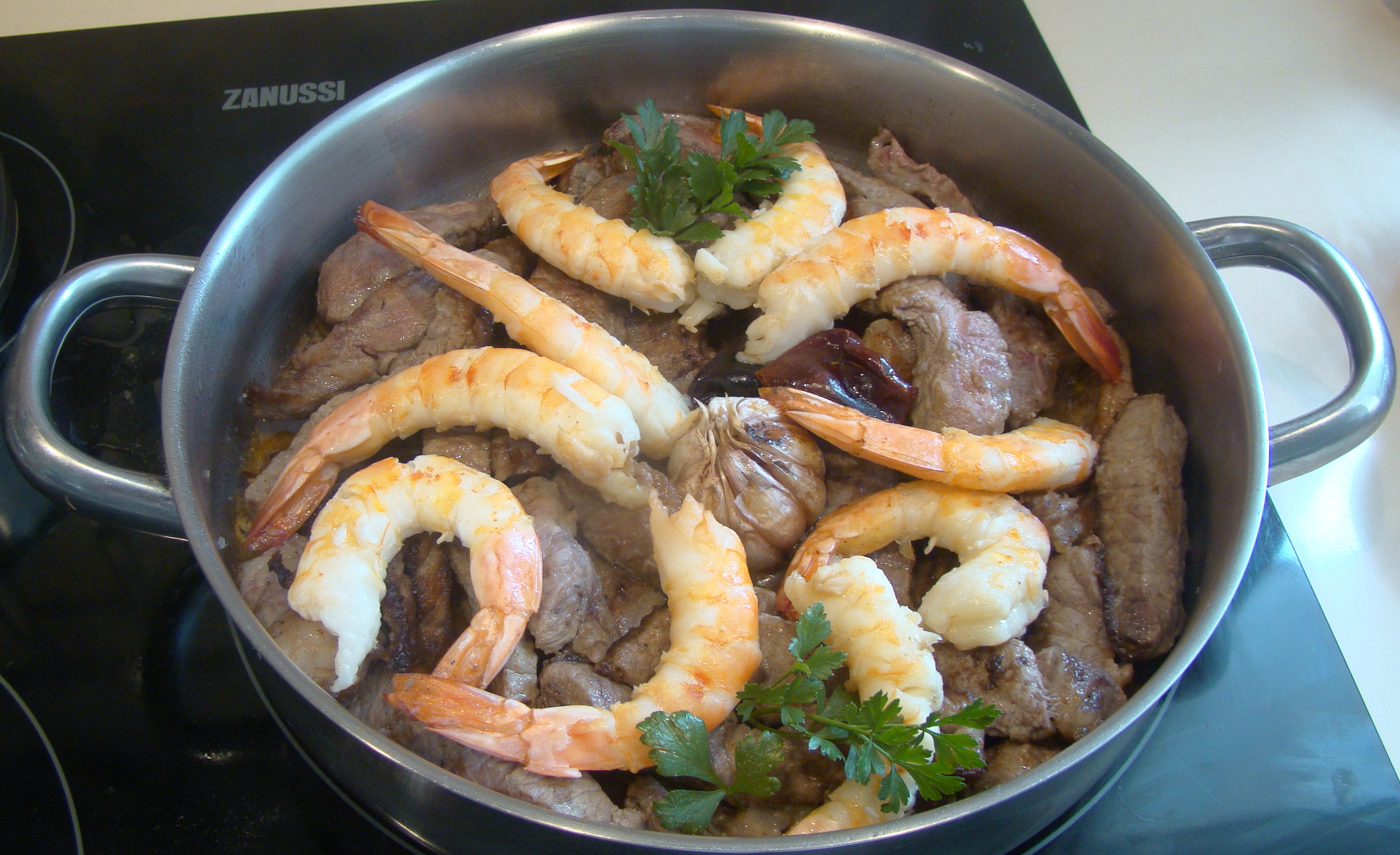 PREPARACIÓN: `primero asamos las gambas con una cucharadita de aceite de oliva virgen. Las pelamos y reservamos; cogemos las cabezas y las guisamos en 1/2 vaso de agua durante 10 minutos. Mientras, en una caldero plano marcamos la carne (vuelta y vuelta con el caldero untado en aceite). Ahora colamos el caldo de las gambas y lo ponemos al fuego junto con la carne, la cabeza de ajo (entera sin pelar), la pimienta partida en 2, el brandy y la sal. Agregamos las gambas y cuando rompa el hervor, apartamos.