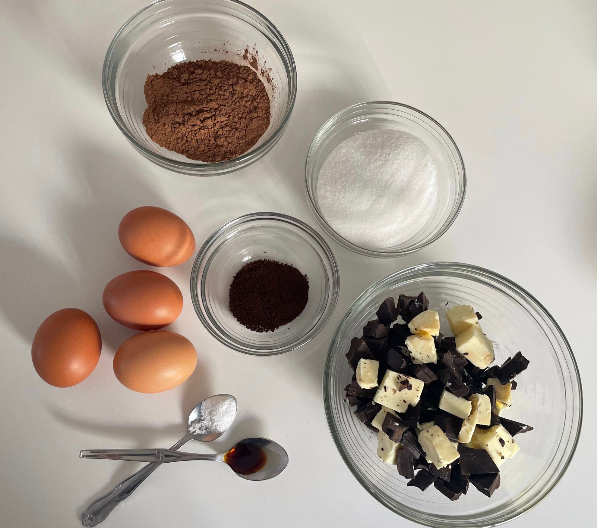 INGREDIENTES: 115 gramos de mantequilla sin sal a temperatura ambiente, 170 gramos de chocolate de calidad al 70%, 135 g de azúcar blanco, 1/3 de taza de cacao puro en polvo, 2 cucharaditas de café descafeinado, 4 huevos L a temperatura ambiente, 1/2 cucharadita de polvos de levantar, 1/8 cucharadita de sal y 1 y 1/2 de esencia de vainilla.