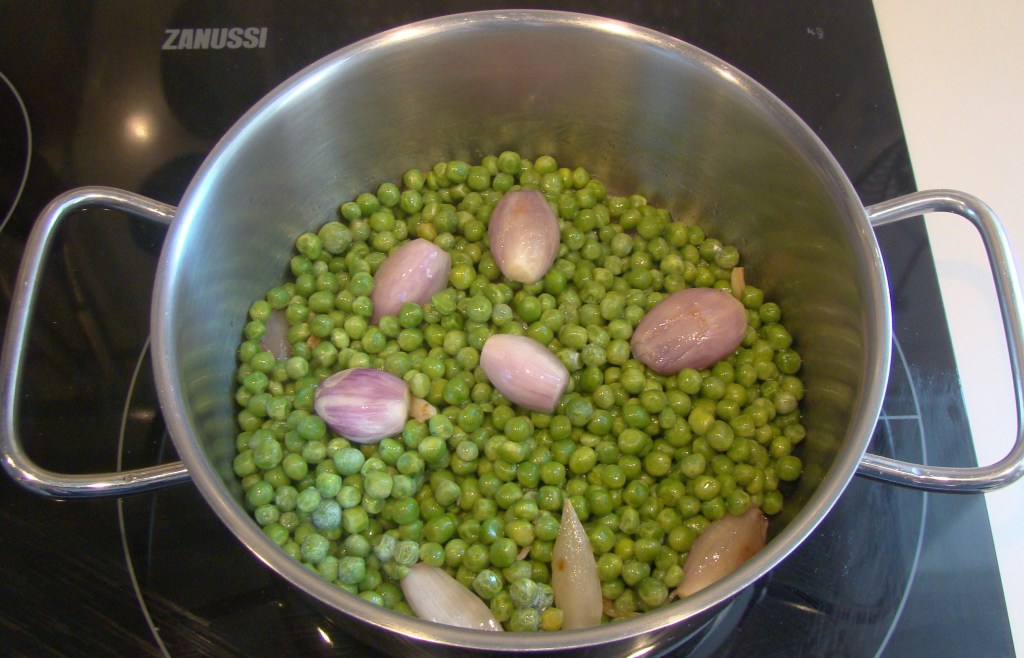 INGREDIENTES: 400 gramos de guisantes, cebollitas, 4 dientes de ajo, 1 cucharada de aceite de oliva, 2 lascas de pan de molde y sal al gusto.