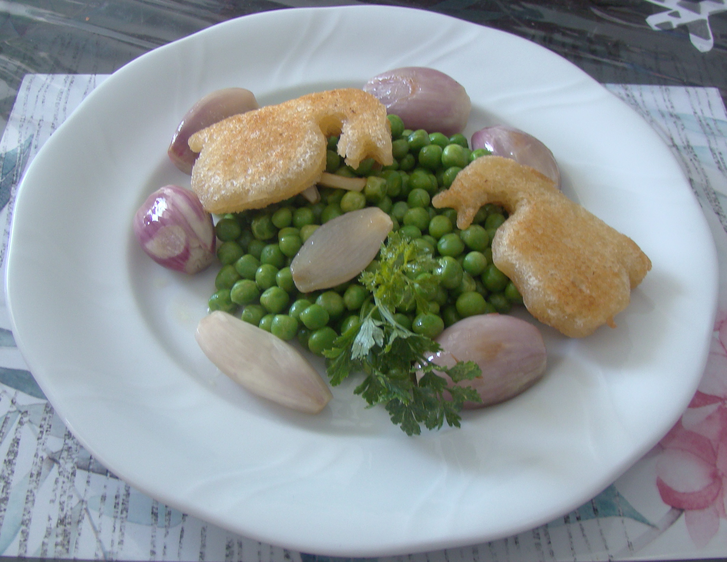PREPARACIÓN: hacemos un sofrito con los ajos y las cebollas. y el aceite. Cuando estén pochadas, agregamos el Brandy, damos un toque de fuego vivo y luego, añadimos los guisantes. Mezclamos y apartamos. En el momento de servir, podemos acompañar con el pan frito, esta vez lo hemos hecho con forma de tortuga.