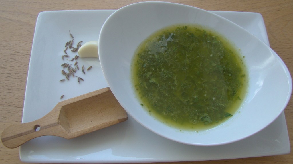 PREPARACIÓN: lavamos el cilantro y le quitamos los tronquitos. Lo ideal es majarlo en el mortero con los ajos y la sal y luego incorporar el resto de ingredientes y mezclar. Si no, ponemos todos los ingredientes en el vaso de la batidora de mano y con unos pocos toques, para evitar q quede todo molido quedará rico también. Para hacer una versión más suave usamos 2 ajos y obviamos las pimientas.
