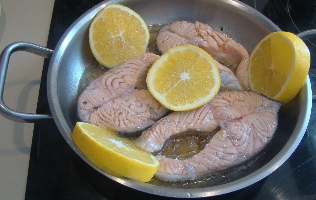 INGREDIENTES: tres rodajas de salmón, 2 cucharadas de aceite de oliva, 1 naranja y sal al gusto.