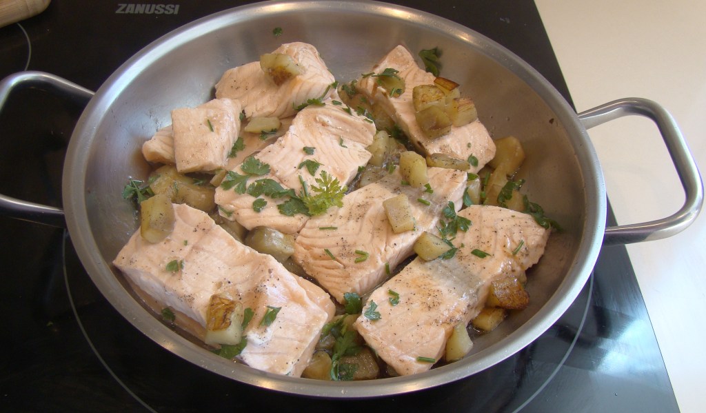 PREPARACIÓN: ponemos el aceite al fuego. Cuando esté caliente, añadimos la berenjena pelada y cortada en trocitos. Cuando esté dorada, ponemos encima los lomos de salmón un minuto, le damos la vuelta, tapamos el caldero y apagamos el fuego. Picamos el perejil, salpimiento lo añadimos y servimos.