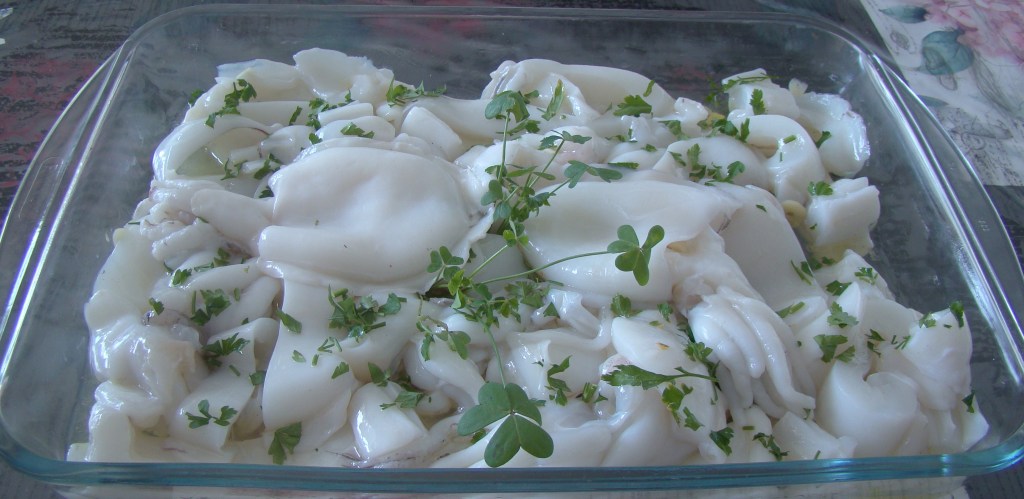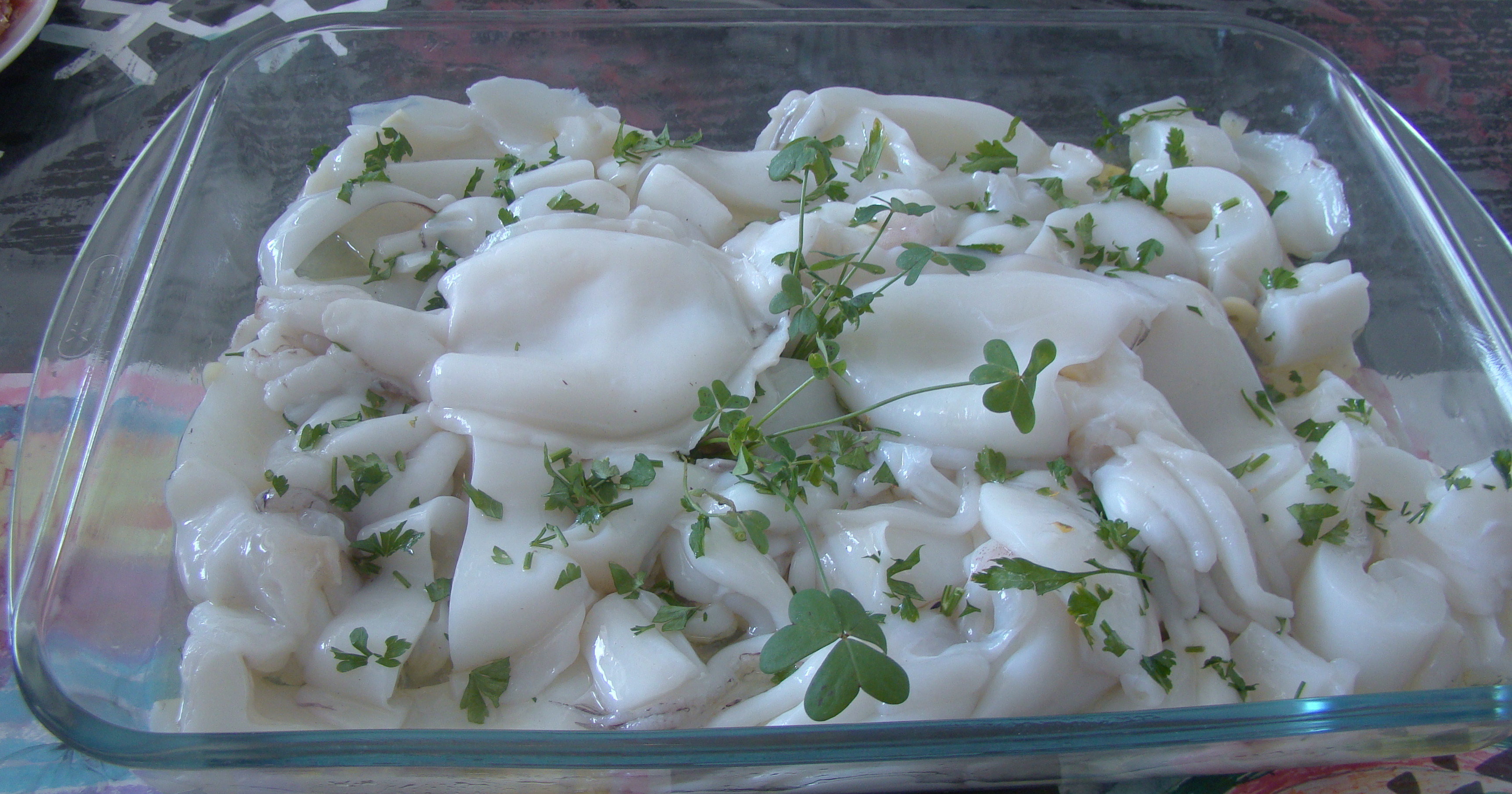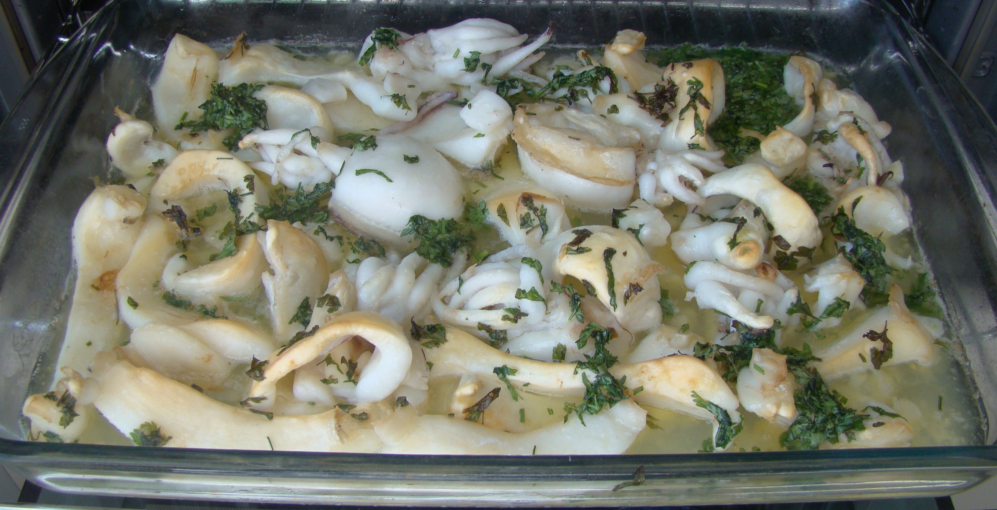 INGREDIENTES: 1 kilo de chocos (congelados), 4 dientes de ajo, 4 cucharadas de aceite de oliva virgen, un ramito de cilantro y sal al gusto.
