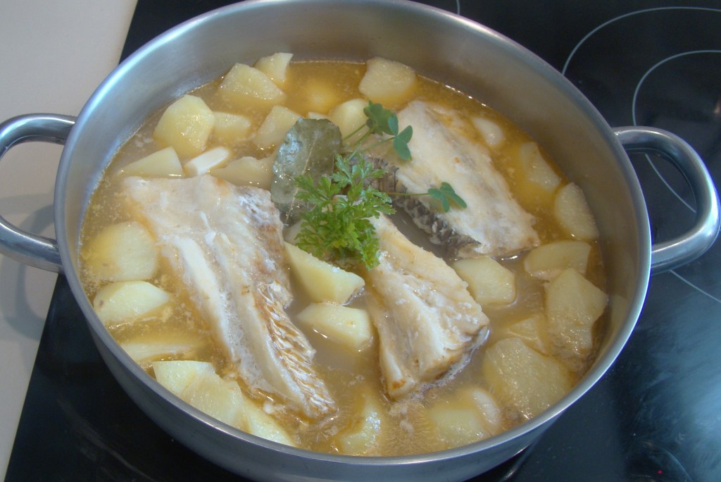 INGREDIENTES: 3 trozos de cherne salado, 4 papas, 3 dientes de ajos, 2 cucharadas de brandy, 1 hoja de laurel, 1/2 cucharadita de comino molido, 3 cucharadas de aceite de oliva y 1/2 vaso de agua.
