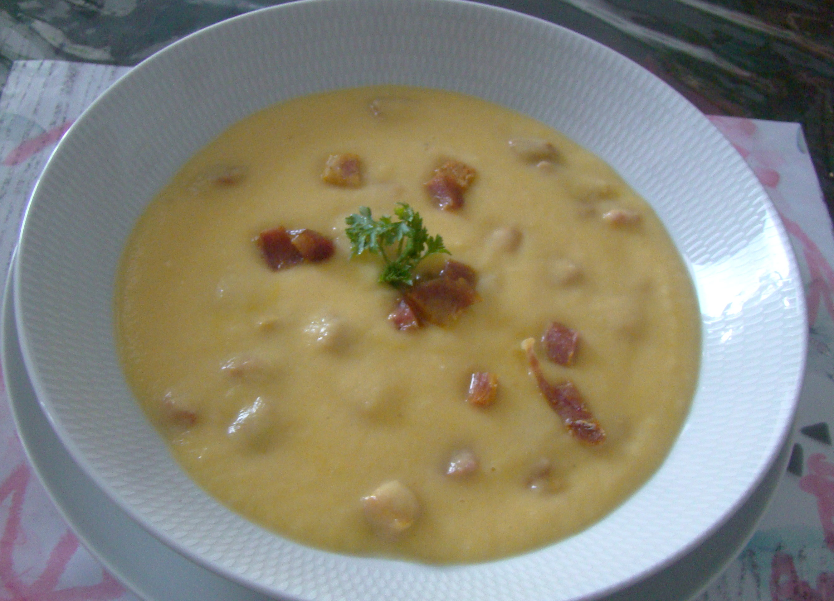 INGREDIENTES: 3 trozos de cherne salado, 4 papas, 3 dientes de ajos, 2 cucharadas de brandy, 1 hoja de laurel, 1/2 cucharadita de comino molido, 3 cucharadas de aceite de oliva y 1/2 vaso de agua.