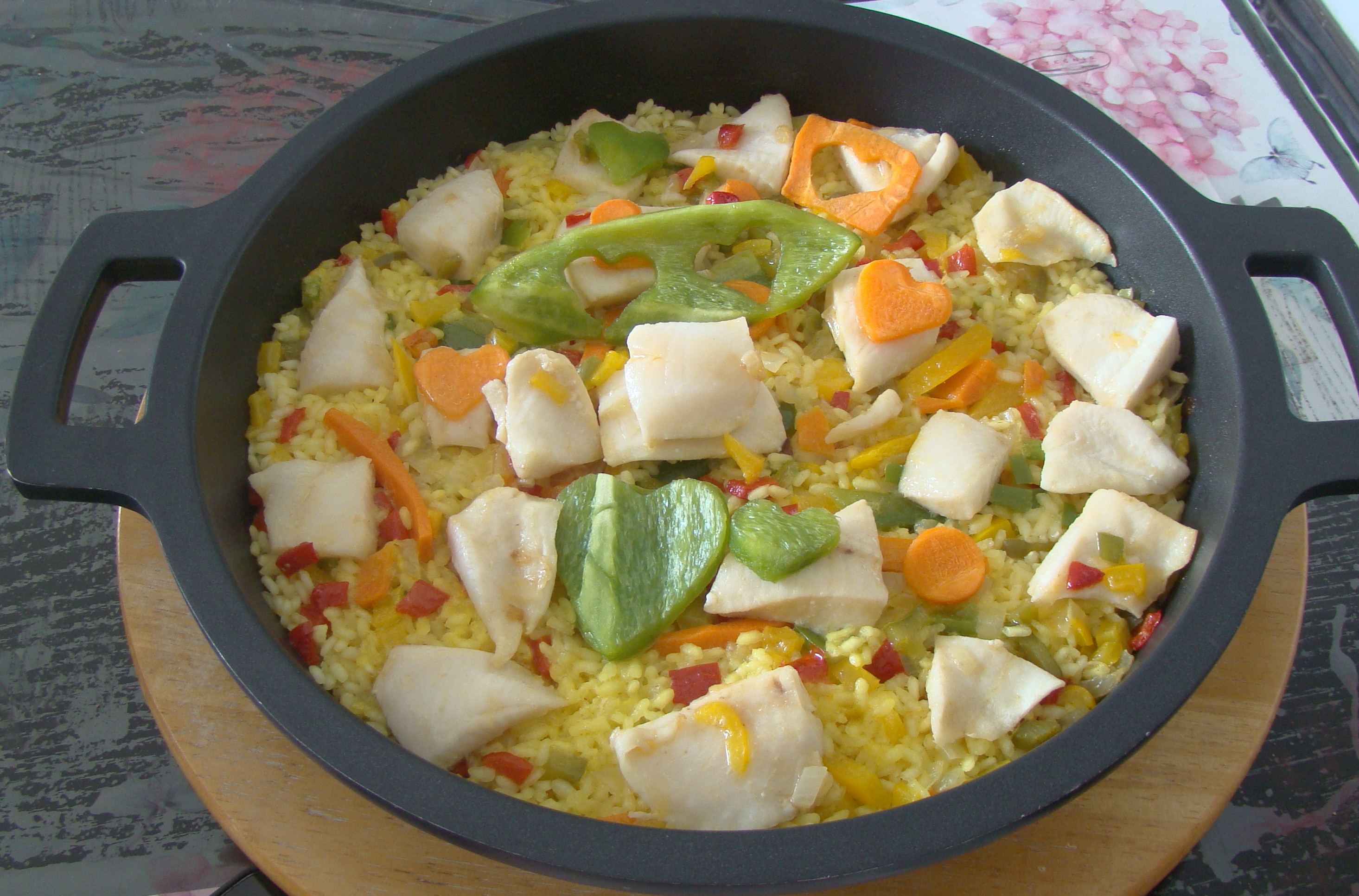 INGREDIENTES: 1 vaso de arroz, 3 lenguados,1 pimiento rojo, 1 pimiento amarillo, 1 pimiento verde, 1 zanahoria, 1 cebolla, 2 dientes de ajo, 2 cucharadas de aceite de oliva, 1 cucharadita de curry, 1 cucharada de brandy y un poquito de sal.