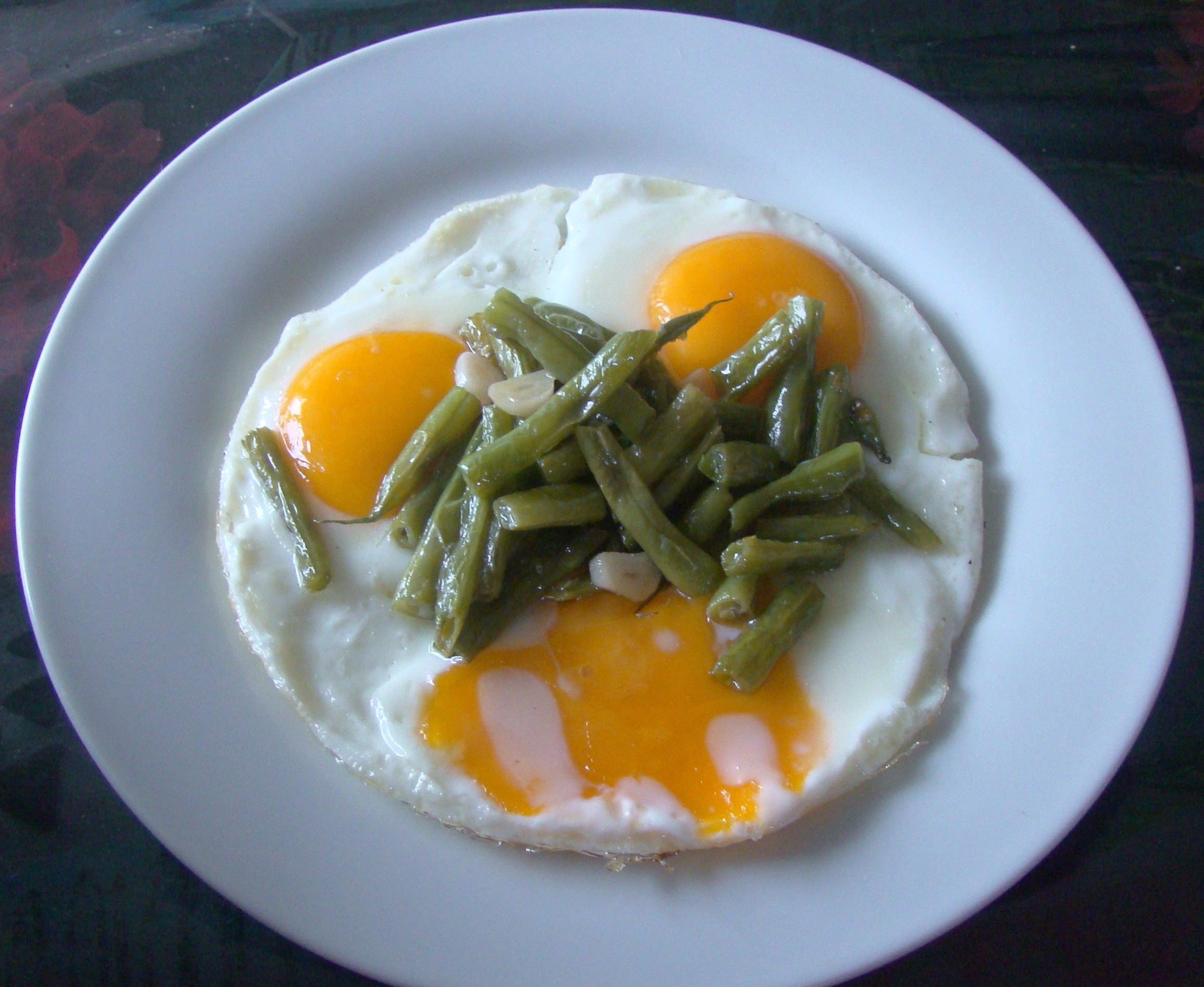 INGREDIENTES: 3 huevos de corral, 100 gramos de habichuelas frescas, 3 dientes de ajo, 1 cucharadita de aceite para freír los huevos y 1 cucharada de aceite para las habichuelas.