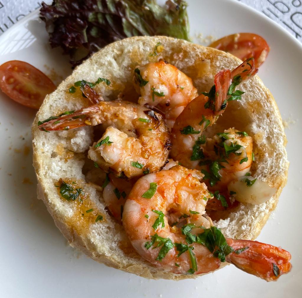 PREPARACIÓN: lavamos las gambas, las pelamos y reservamos. Ponemos el aceite en una sartén calentamos y le añadimos los ajos pelados y cortados, la pimienta entera y los doramos, ponemos las gambas peladas y sofreímos aproximadamente 2 minutos, las ponemos en el pan con el perejil picadito y servimos.