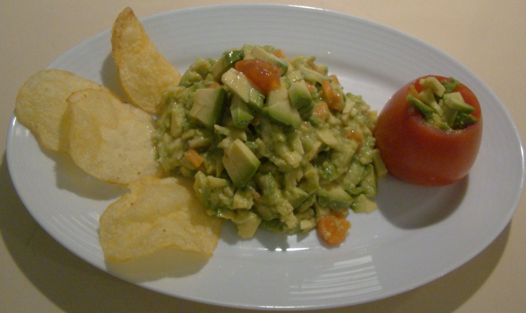 PREPARACIÓN: escachamos 1 aguacate, el otro lo cortamos en trocitos pequeñitos, vaciamos el tomate y lo añadimos, la papaya pelada y cortada en trocitos, añadimos el aceite, el limón y mezclamos con mucha suavidad. Lo acompañamos con papas chips.