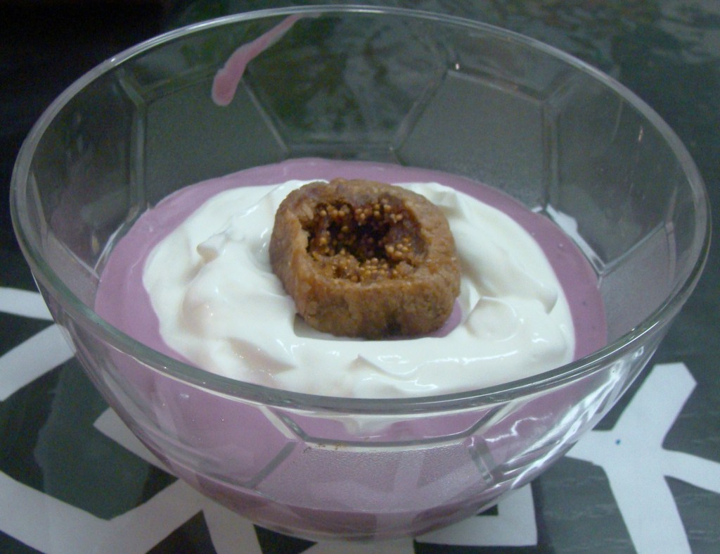 INGREDIENTES: 6 cucharadas de yogur griego, 6 cucharadas de yogur de arándanos,1 cucharada de pipas de calabaza y 3 higos pasados.