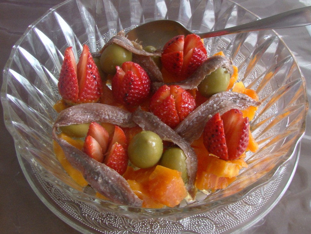 INGREDIENTES: fresas, papaya, miel de palma de la gomera, 8 aceitunas grandes, 1 lata de anchoas de 45 gramos y 1 cucharadita de aceite de oliva