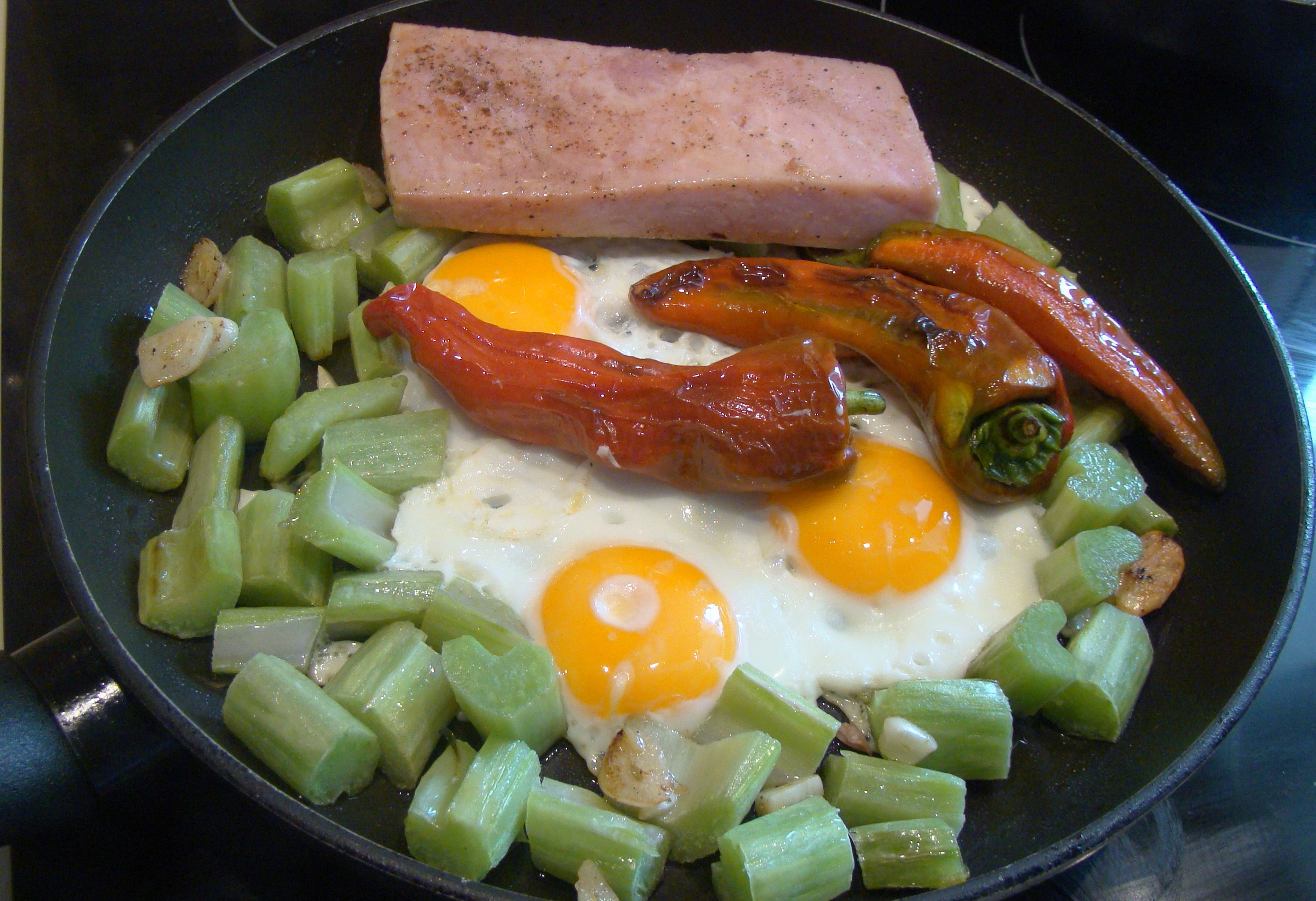 PREPARACIÓN: ponemos en la sartén: el aceite, los tallos de col picaditos y los asamos; añadimos los huevos. En otra sartén asamos los pimientos, sacamos y reservamos, con el mismo aceite y 2 dientes de ajo asamos el jamón.